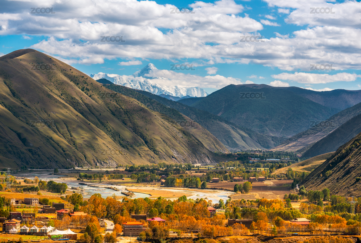 中國四川甘孜貢嘎山下的新都橋鎮(zhèn)秋季風(fēng)光