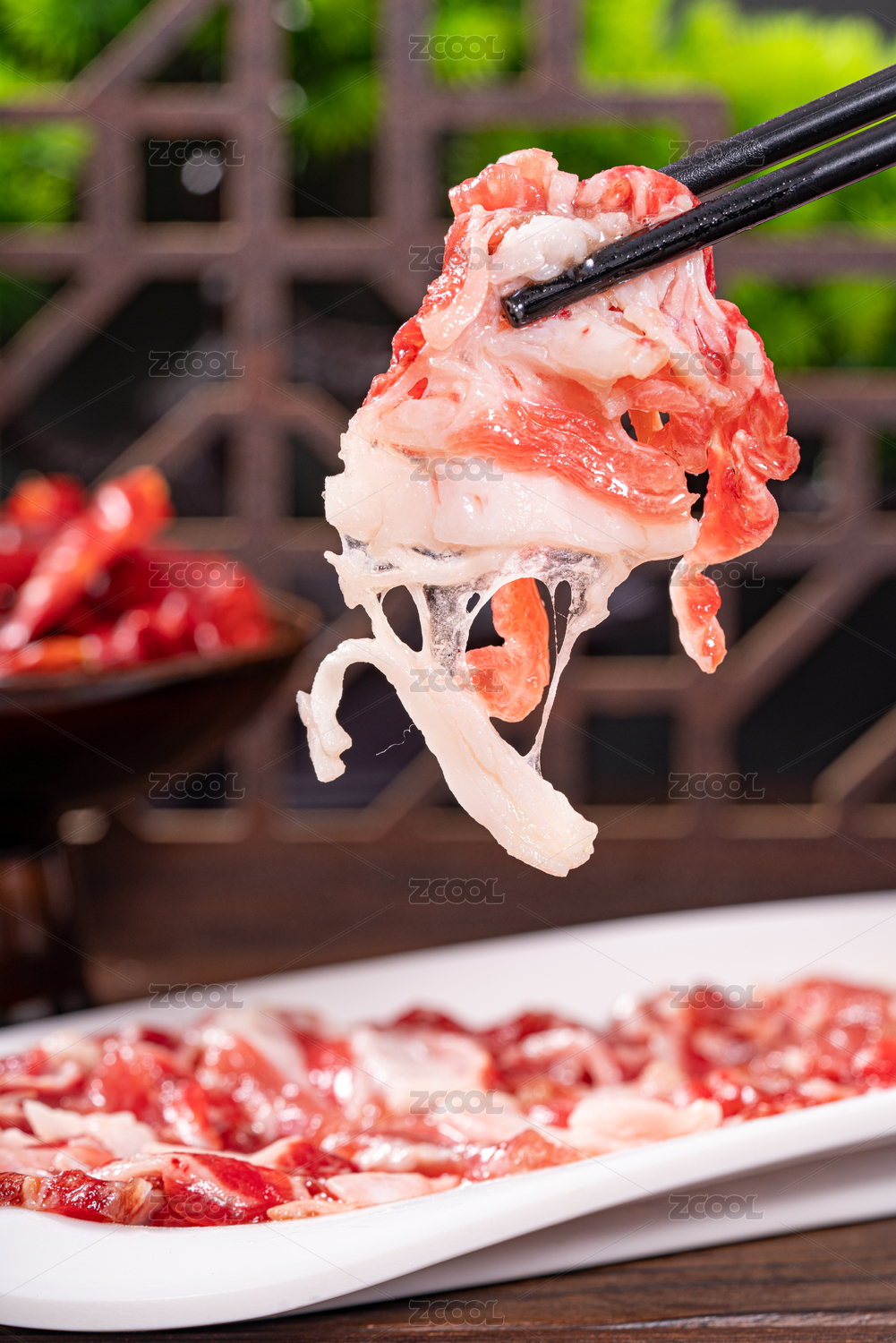 木紋桌上有一盤生制牛胸口肉片