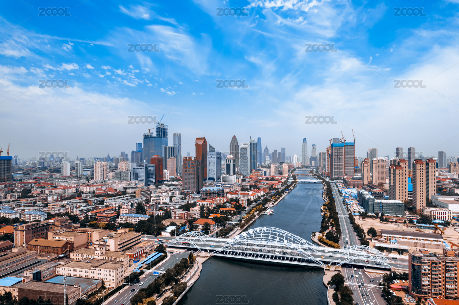 中國(guó)天津海河直沽和直沽橋城市天際線航拍