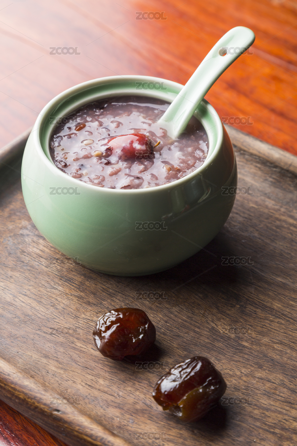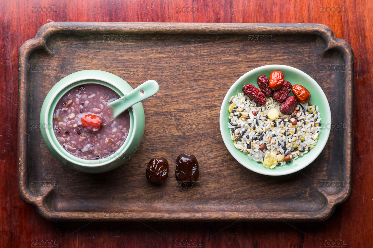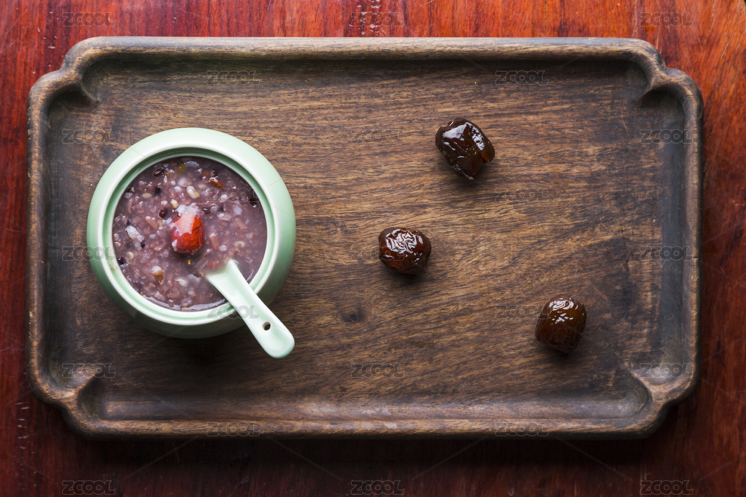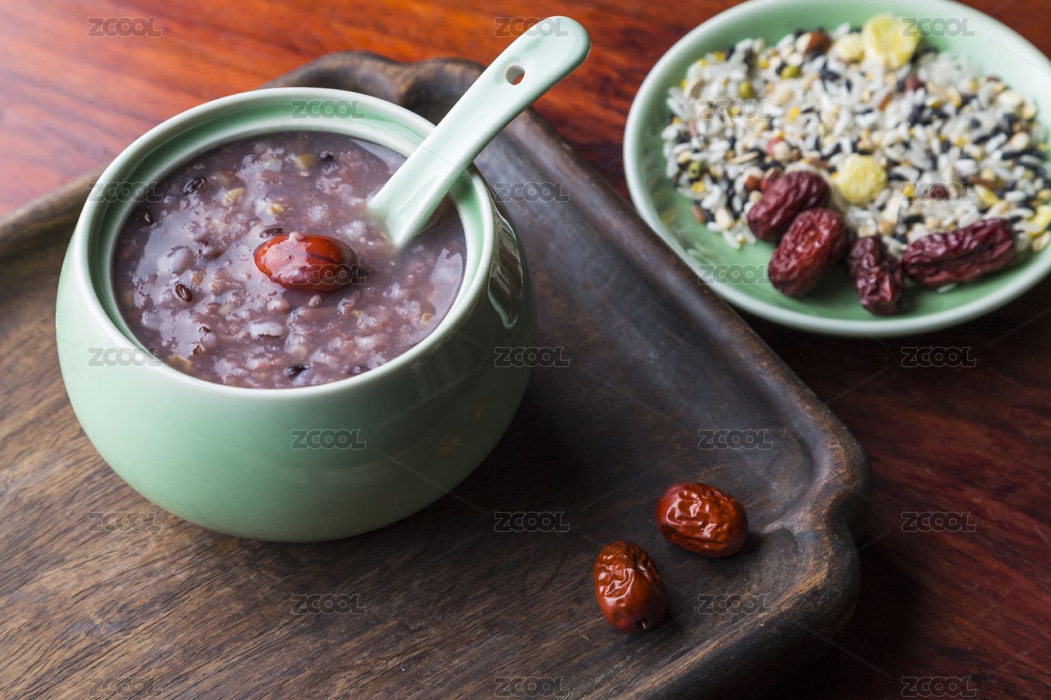 一碗紅棗薏仁養(yǎng)生粥放在復古實木托盤里
