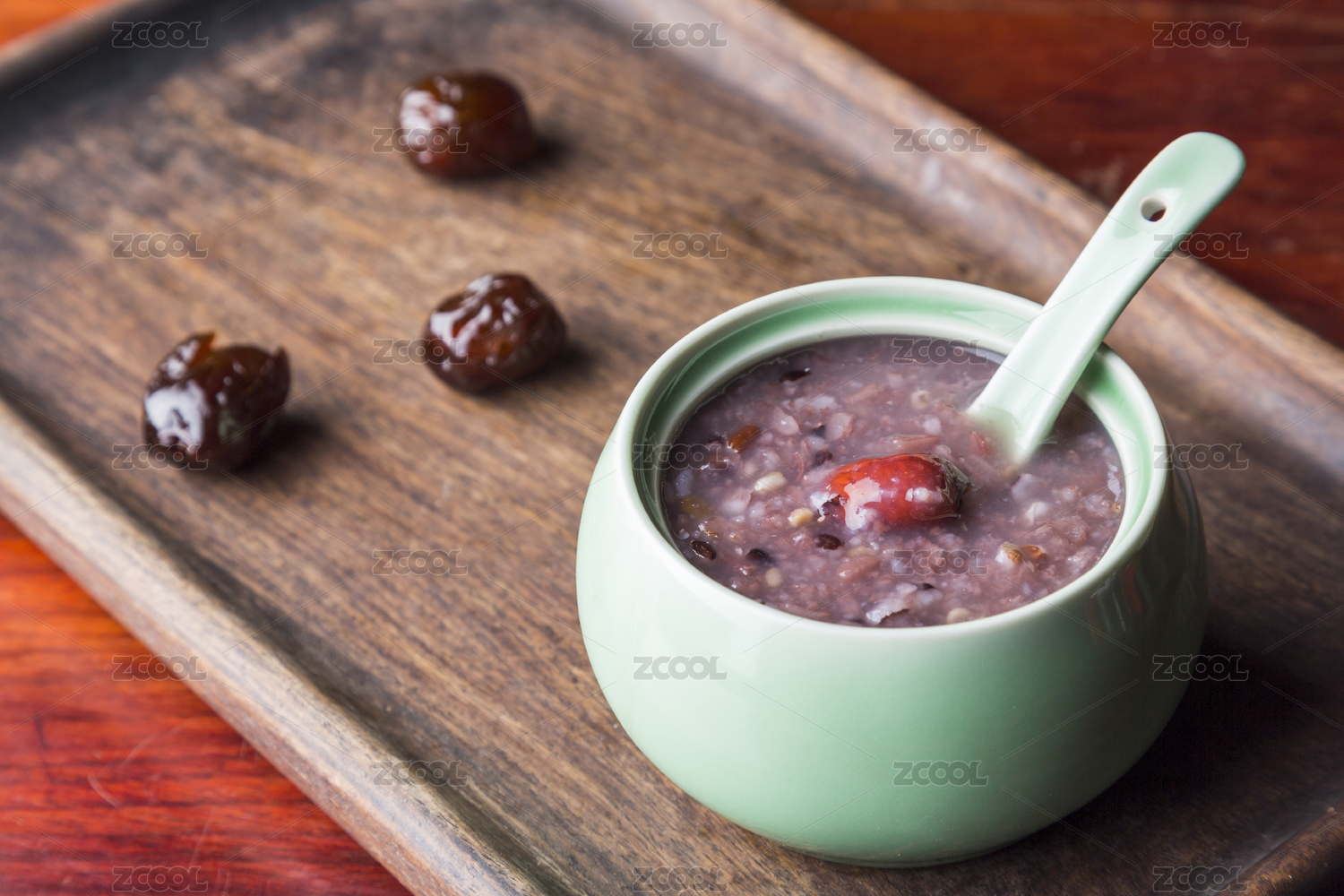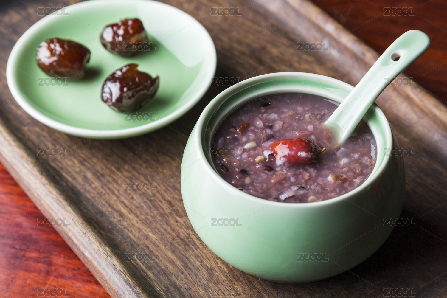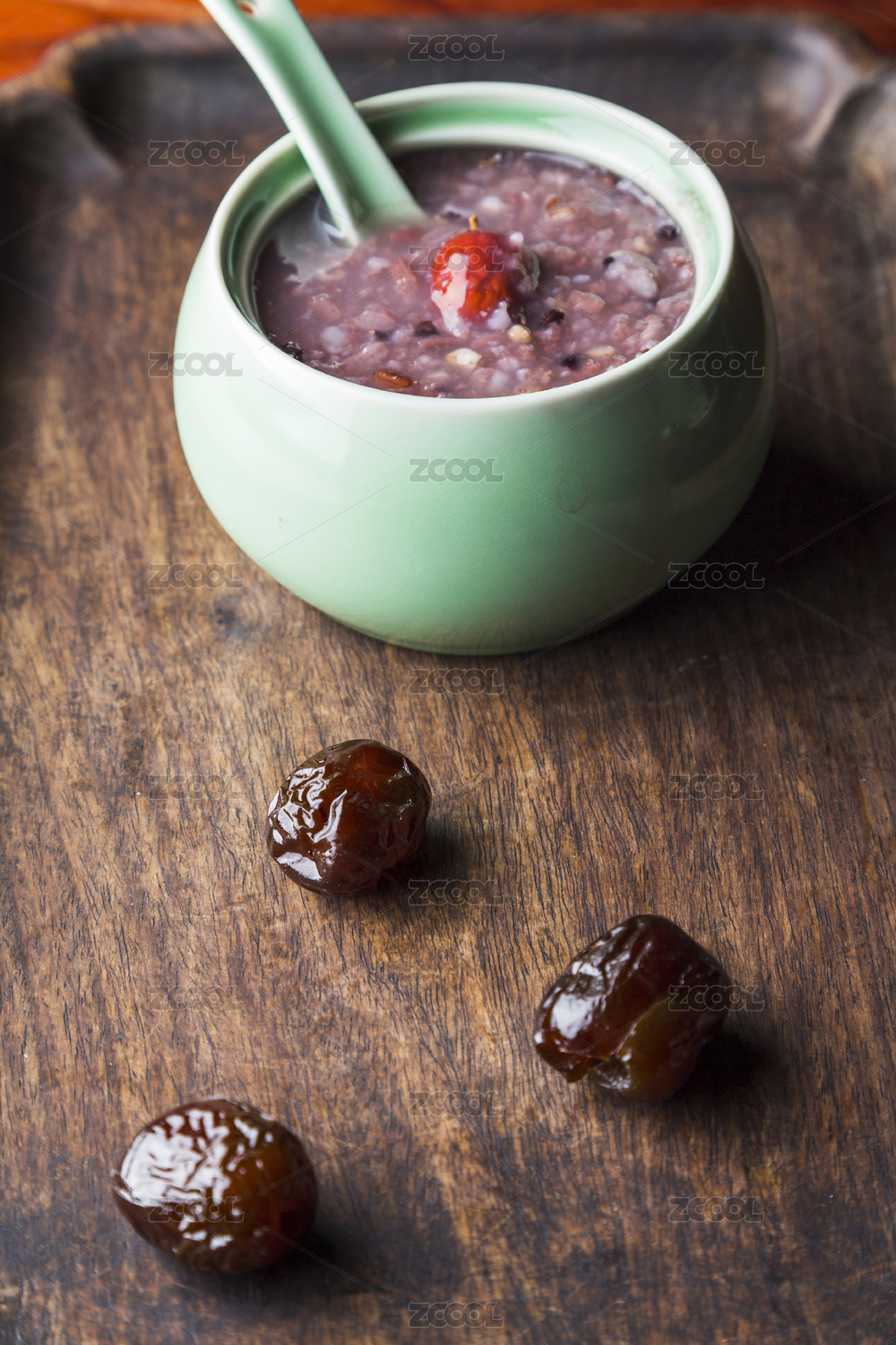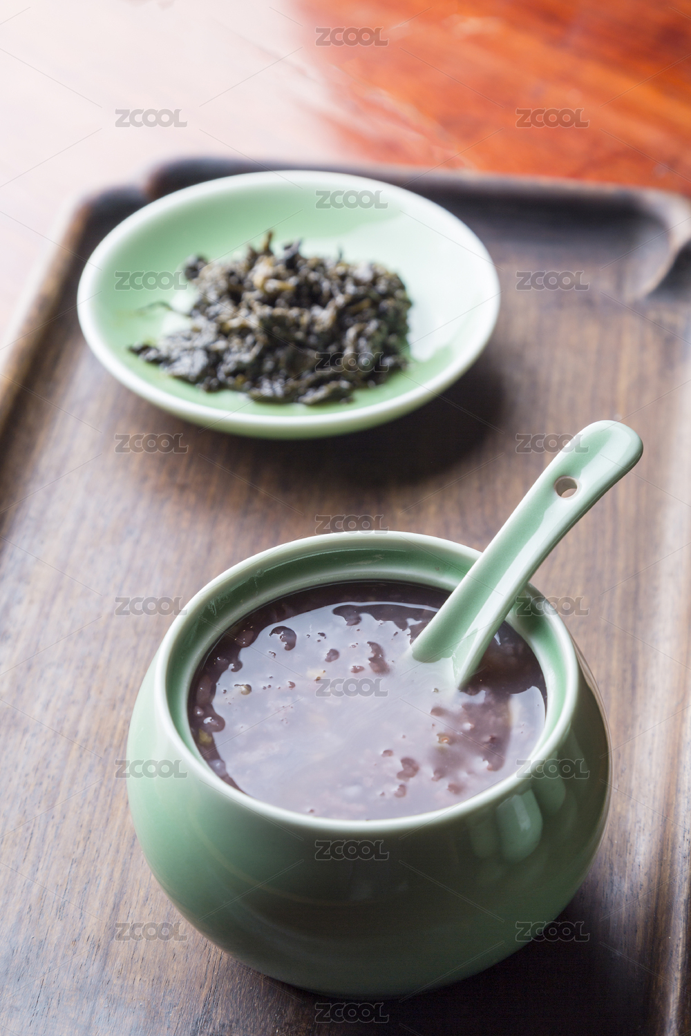 一碗紅棗薏仁養(yǎng)生粥放在復古實木托盤里