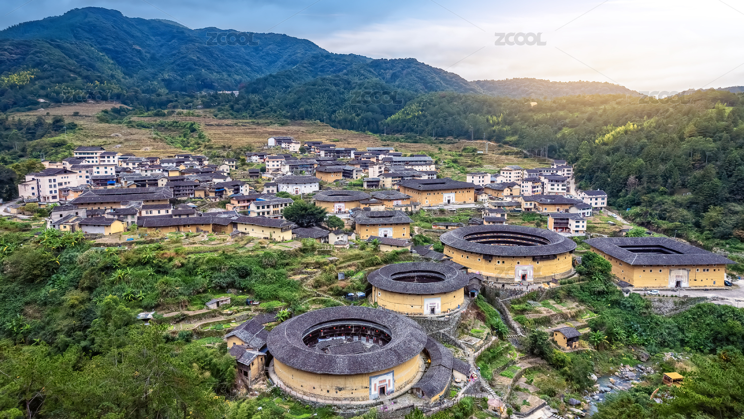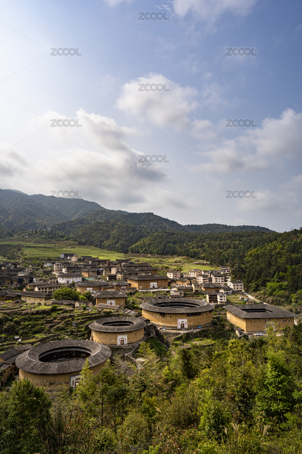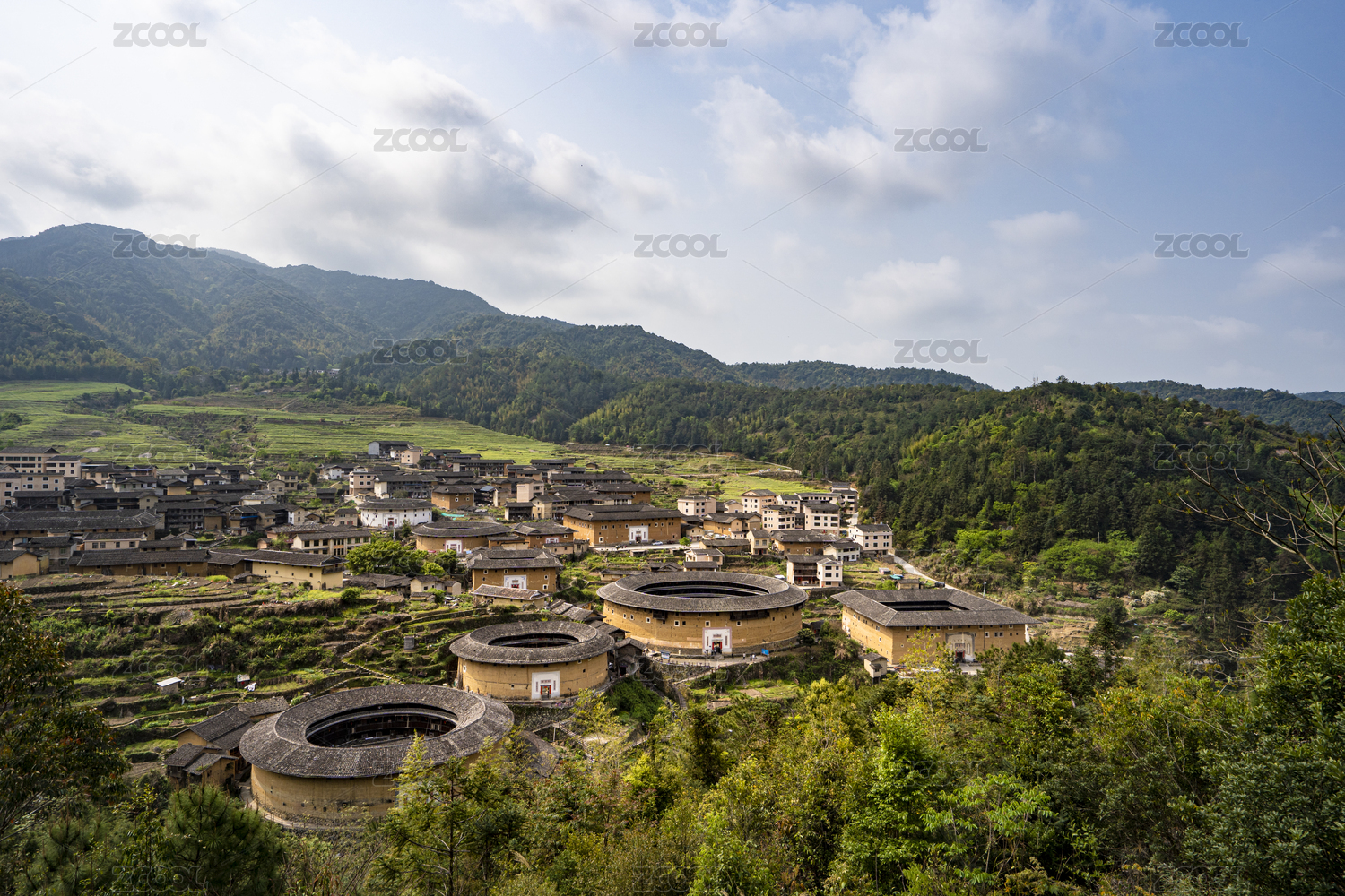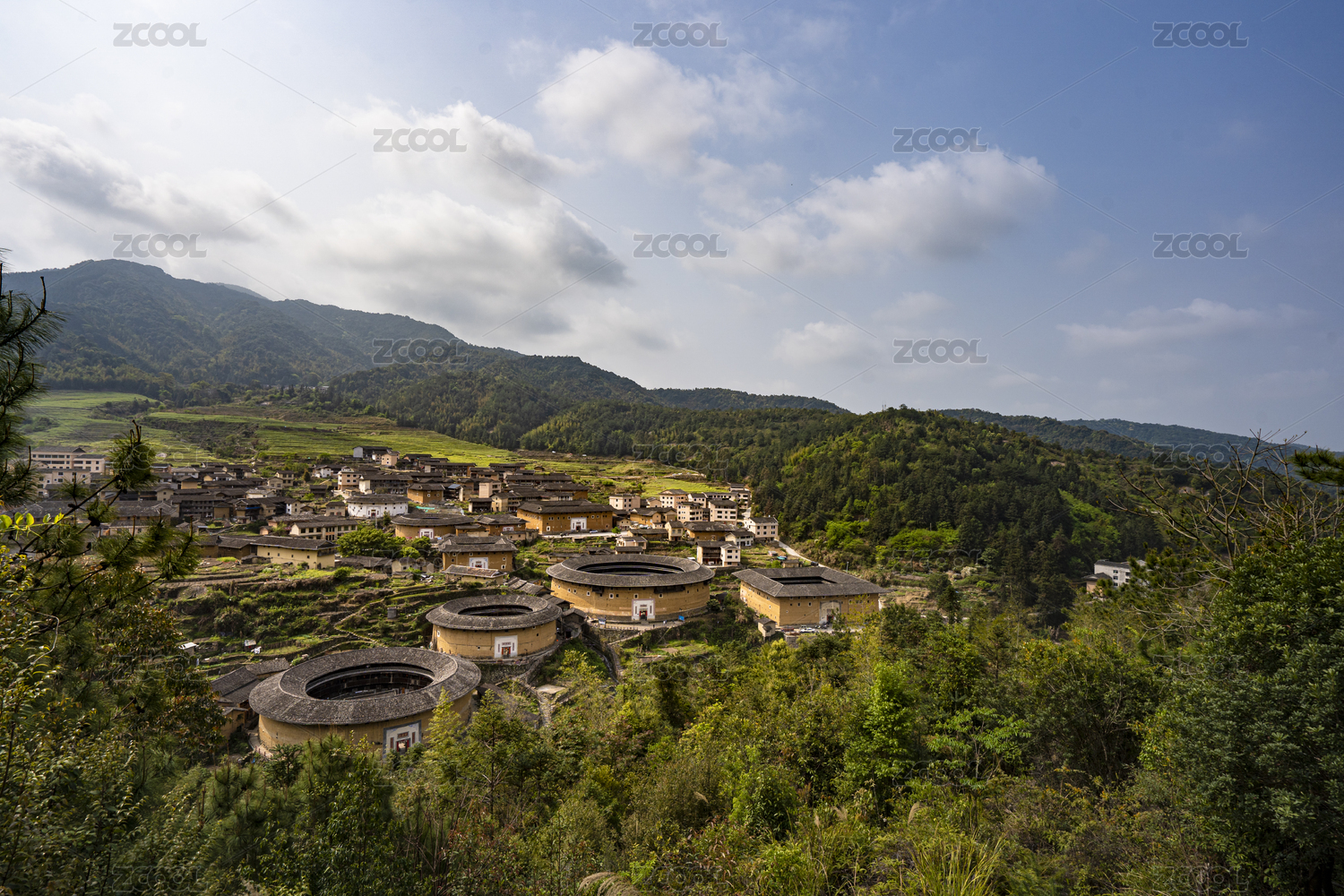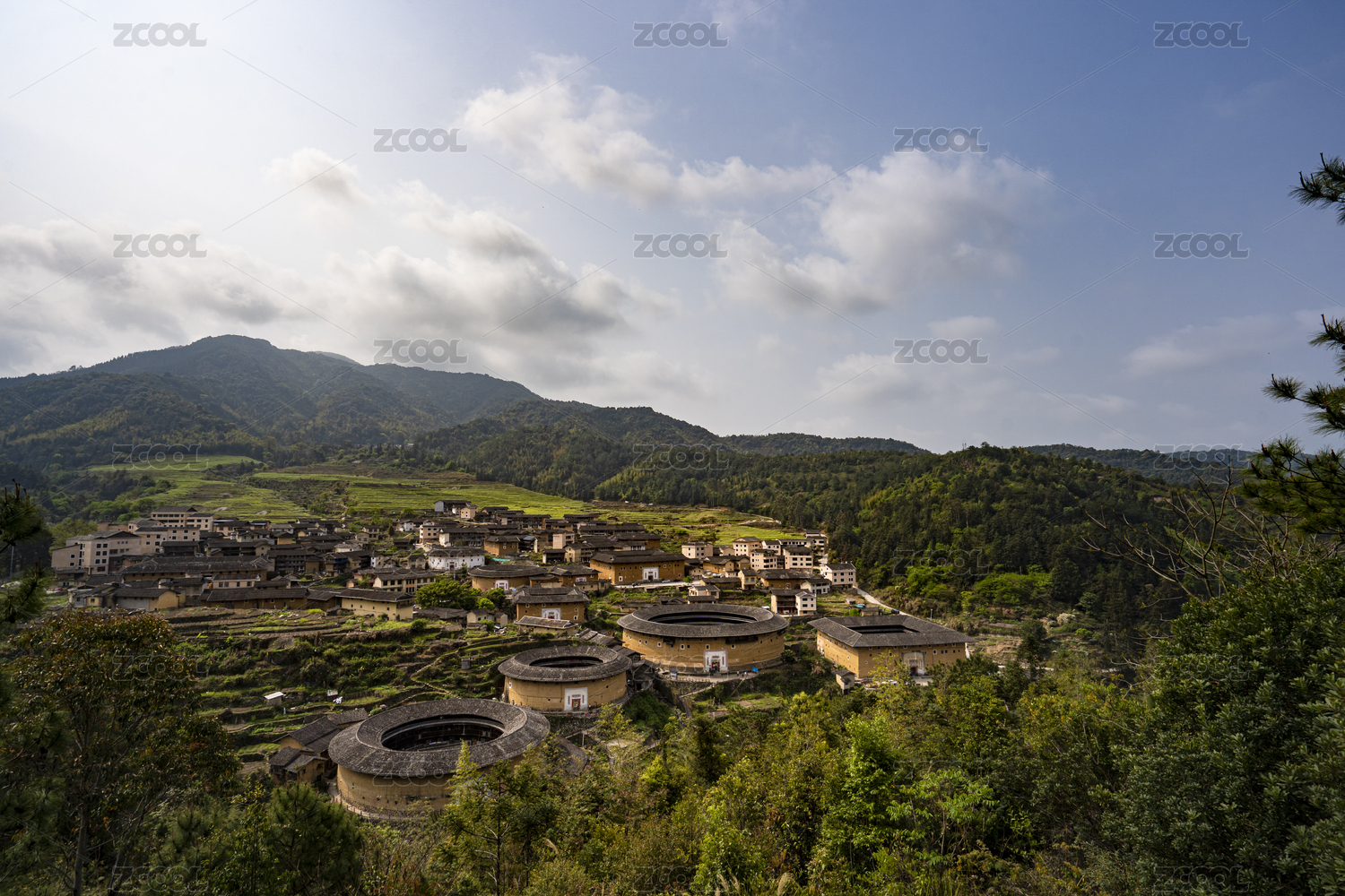福建省龍巖市初溪土樓青山環(huán)繞的鄉(xiāng)村風光