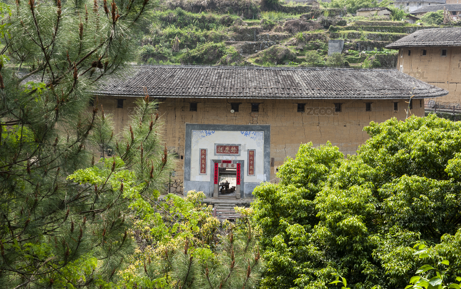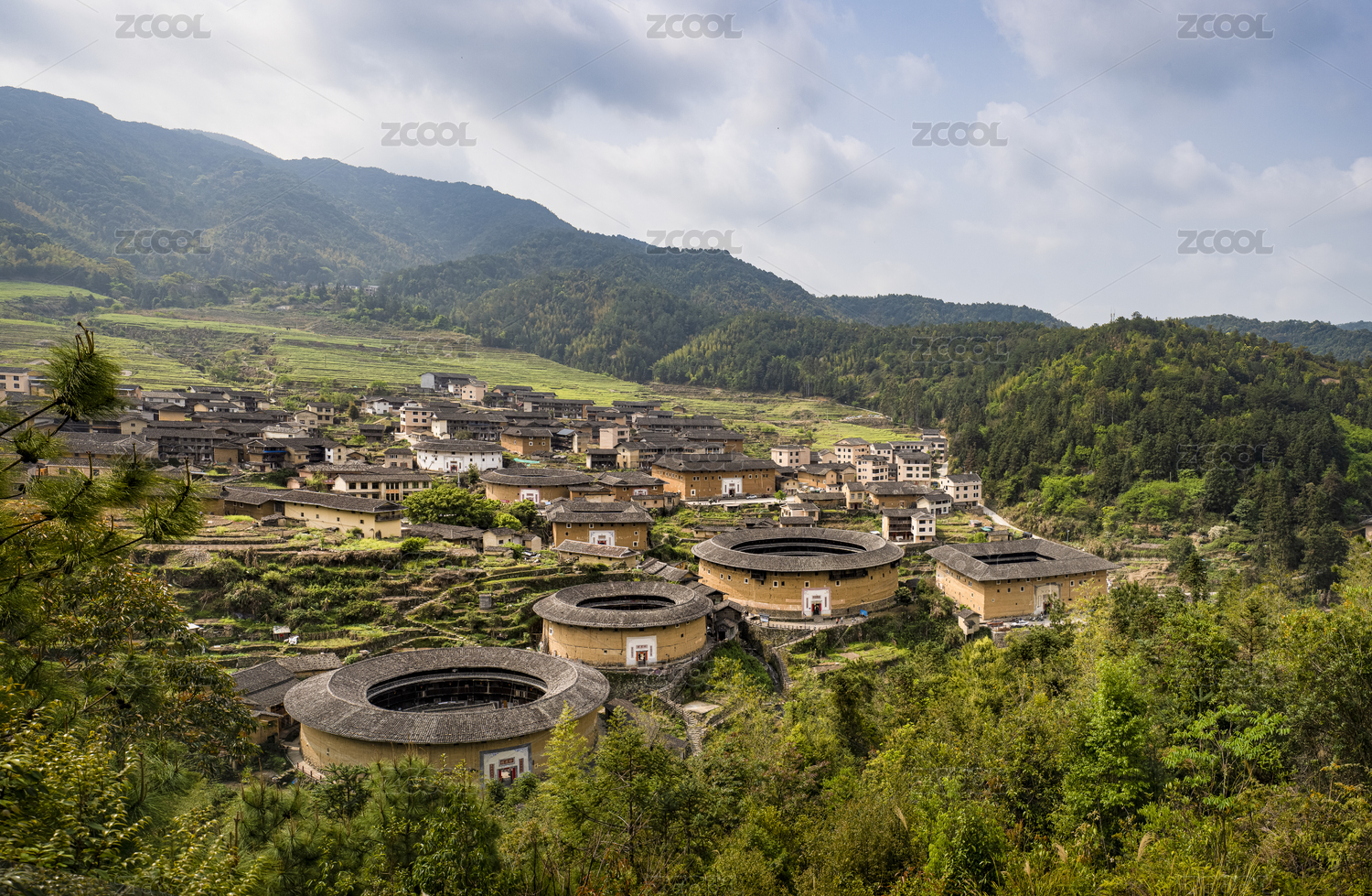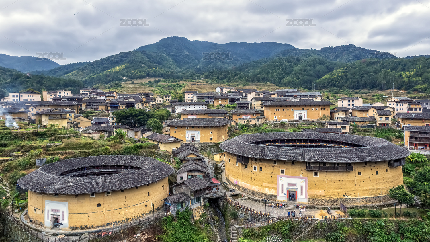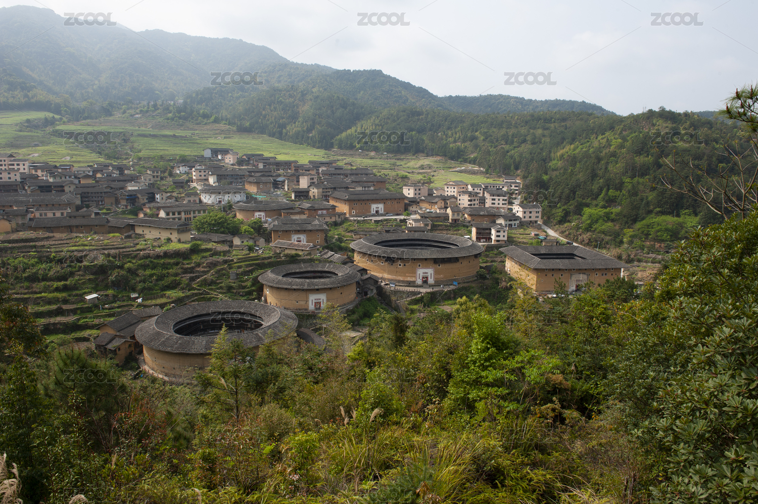福建省龍巖市初溪土樓青山環(huán)繞的鄉(xiāng)村風光
