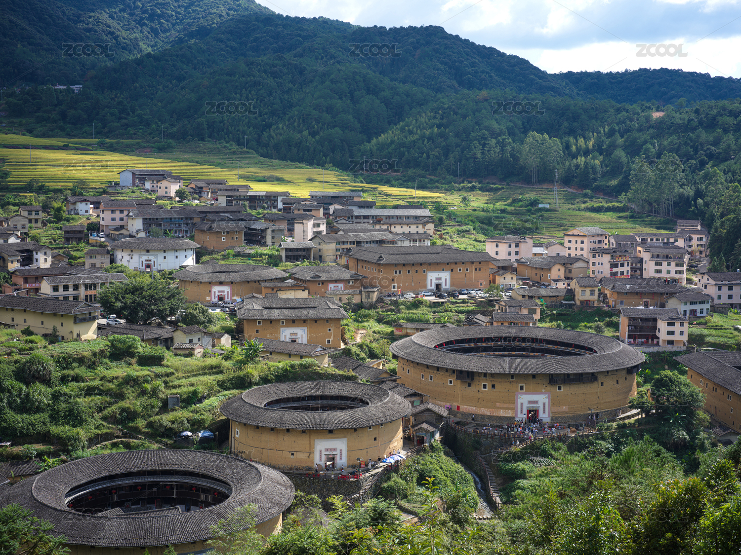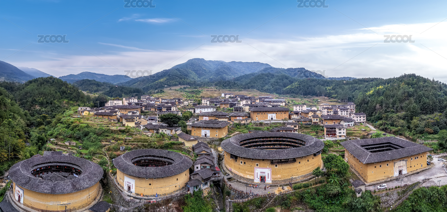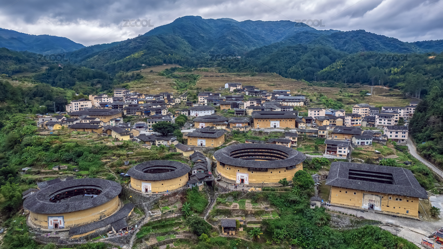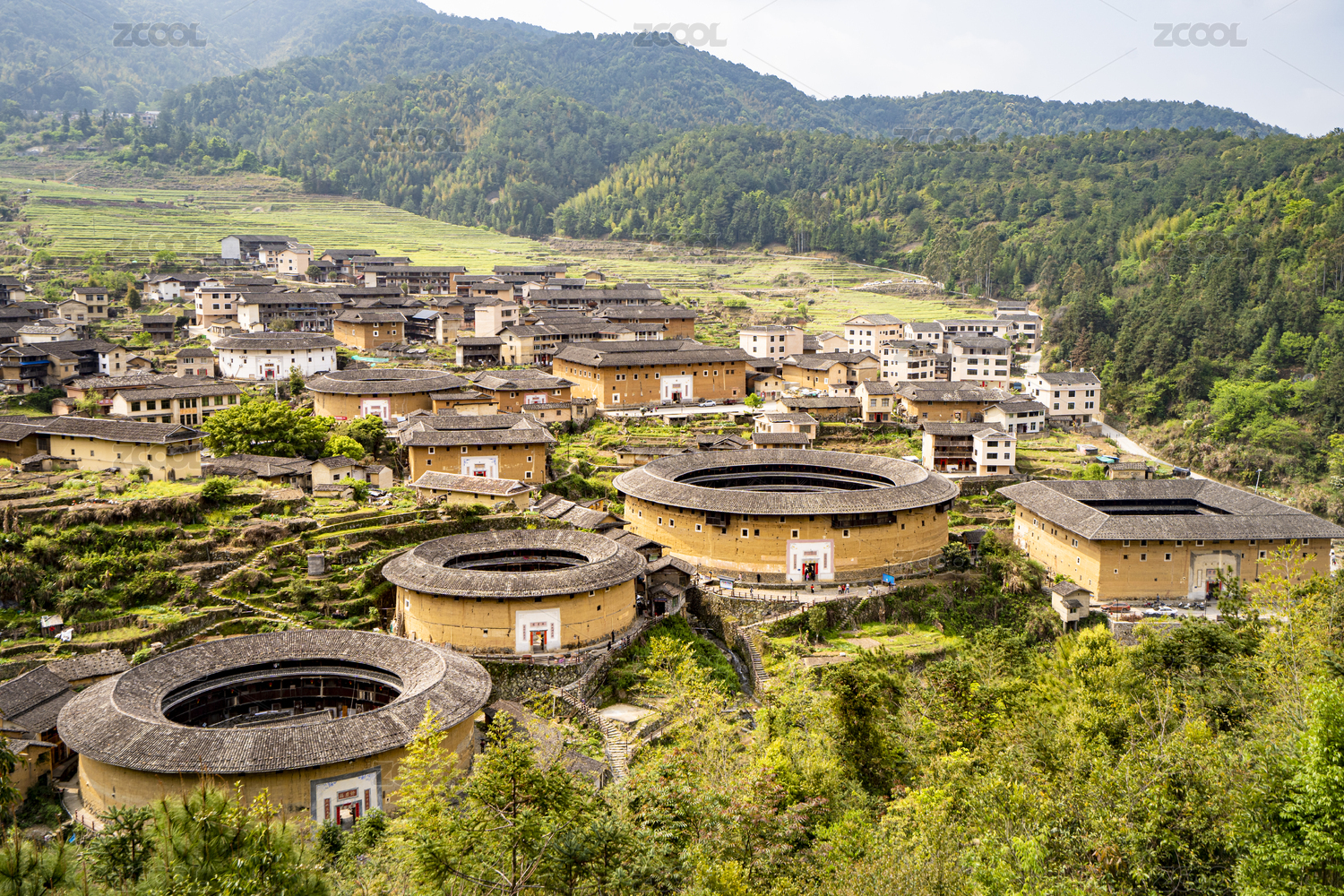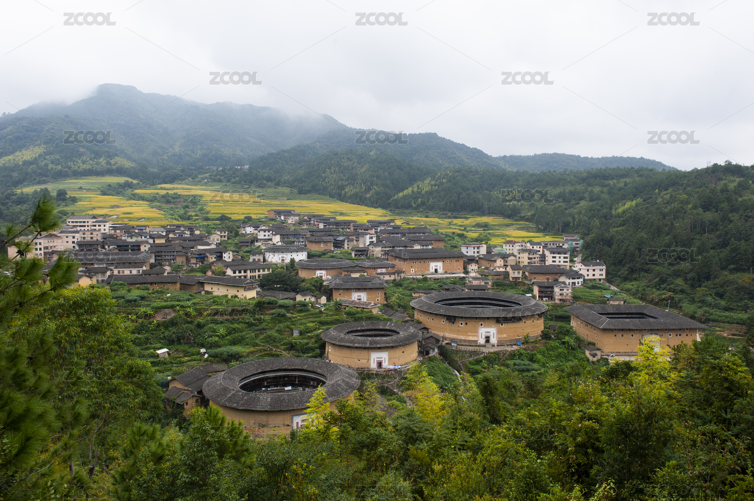 福建省龍巖市初溪土樓青山環(huán)繞的鄉(xiāng)村風光