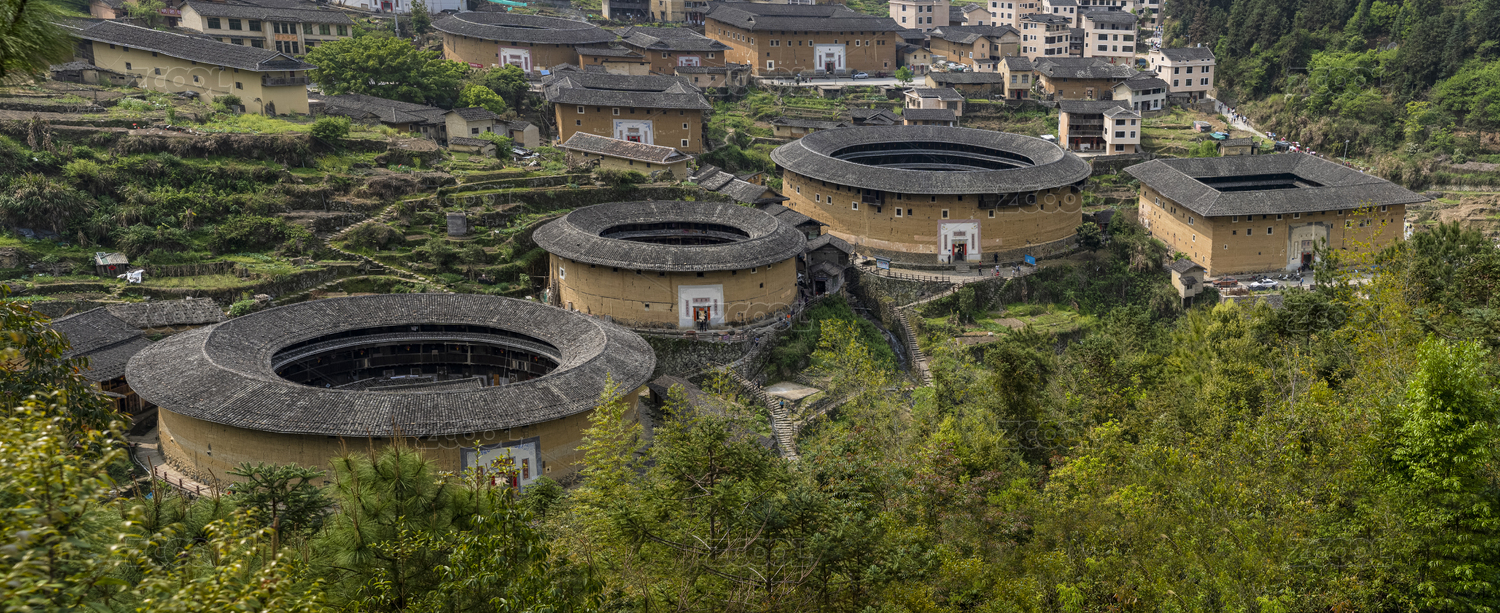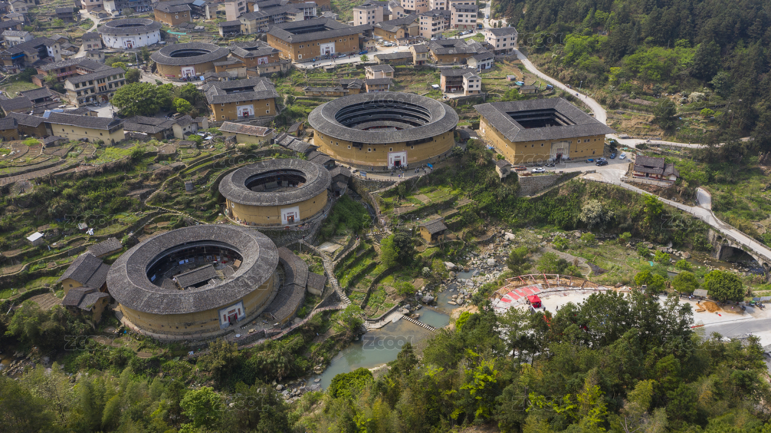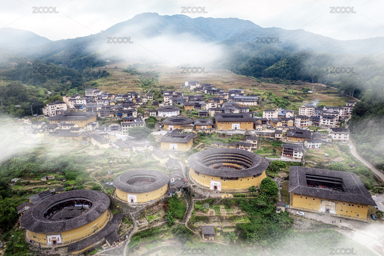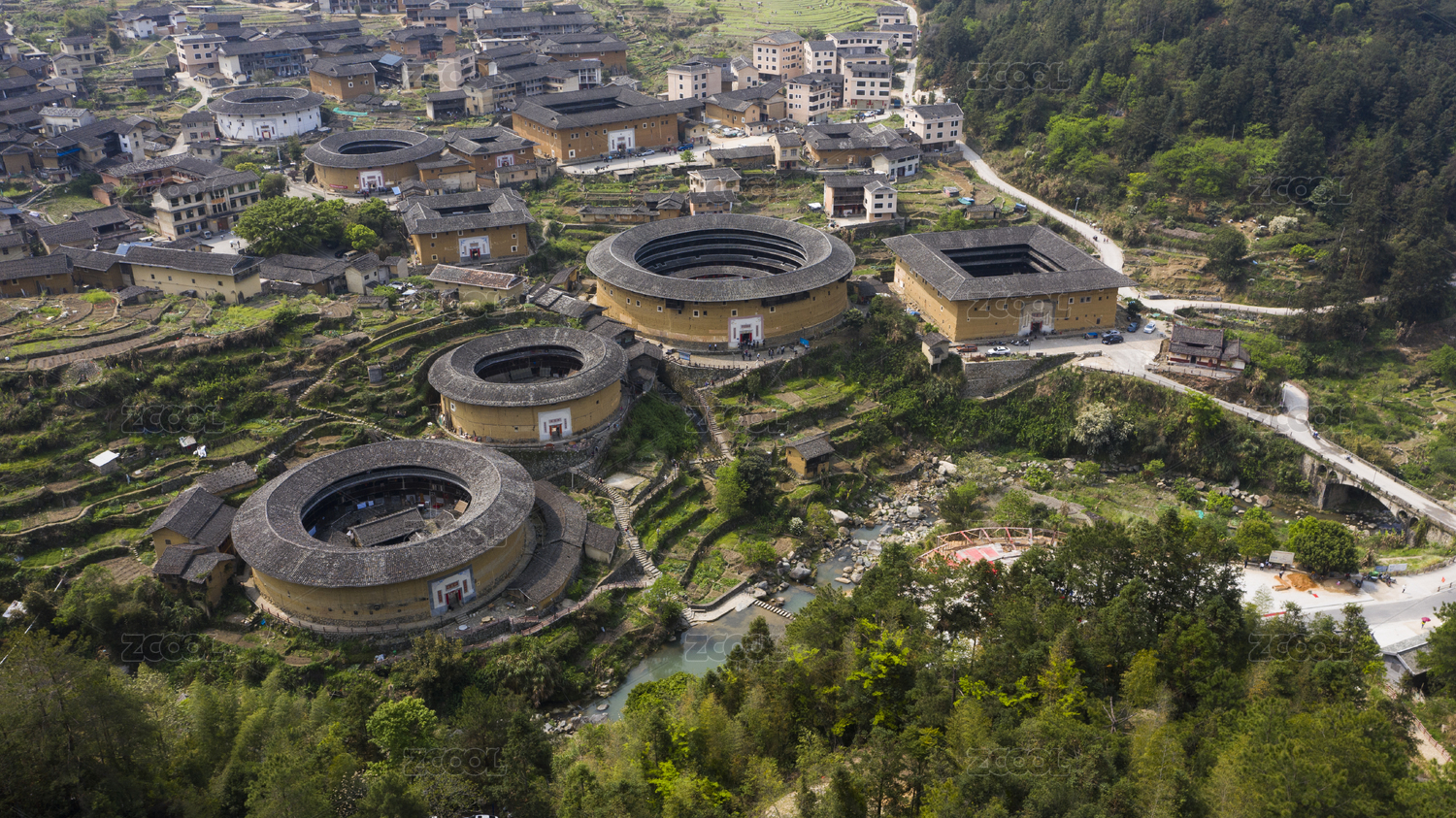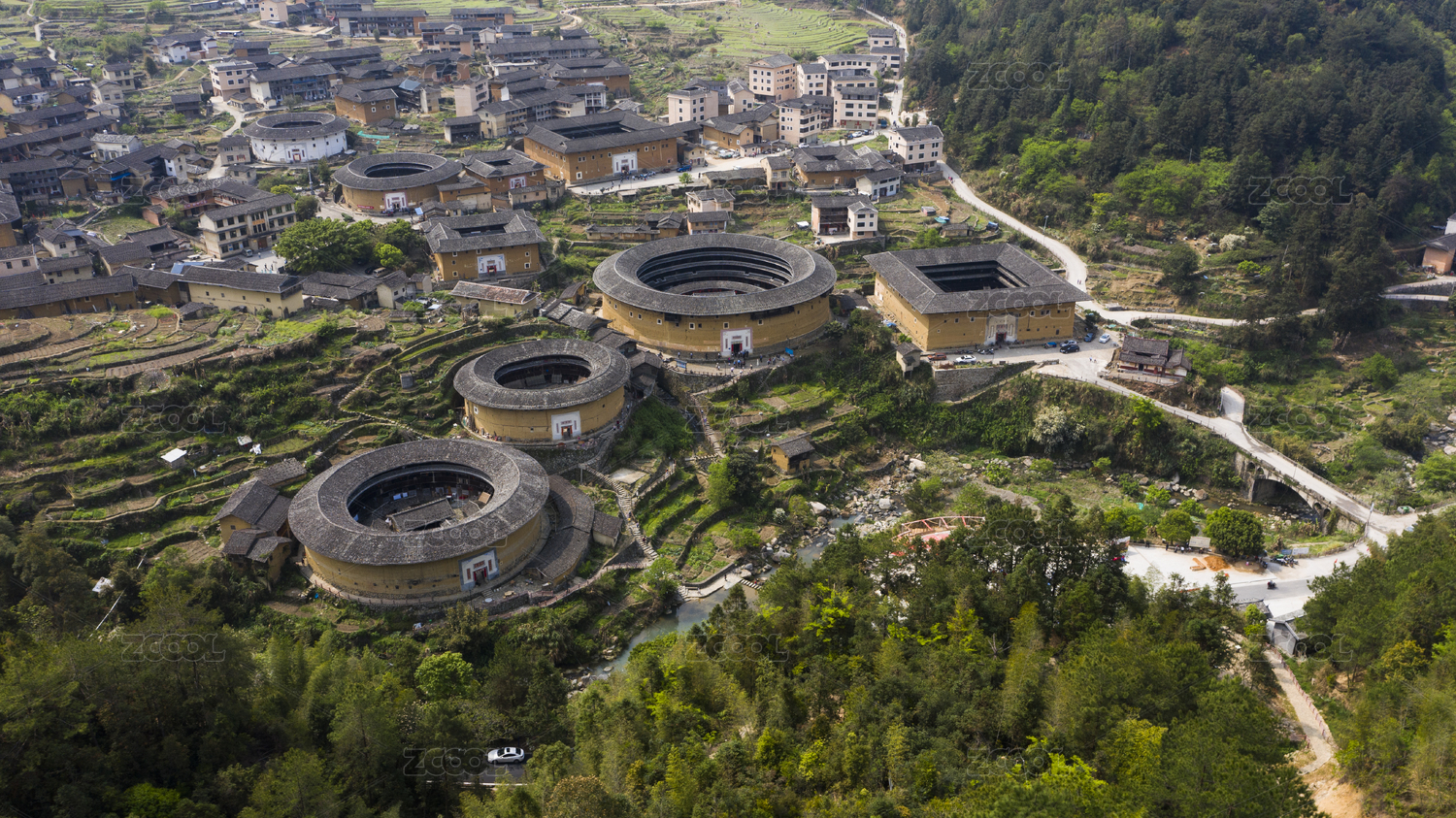 福建省龍巖市初溪土樓青山環(huán)繞的鄉(xiāng)村風光