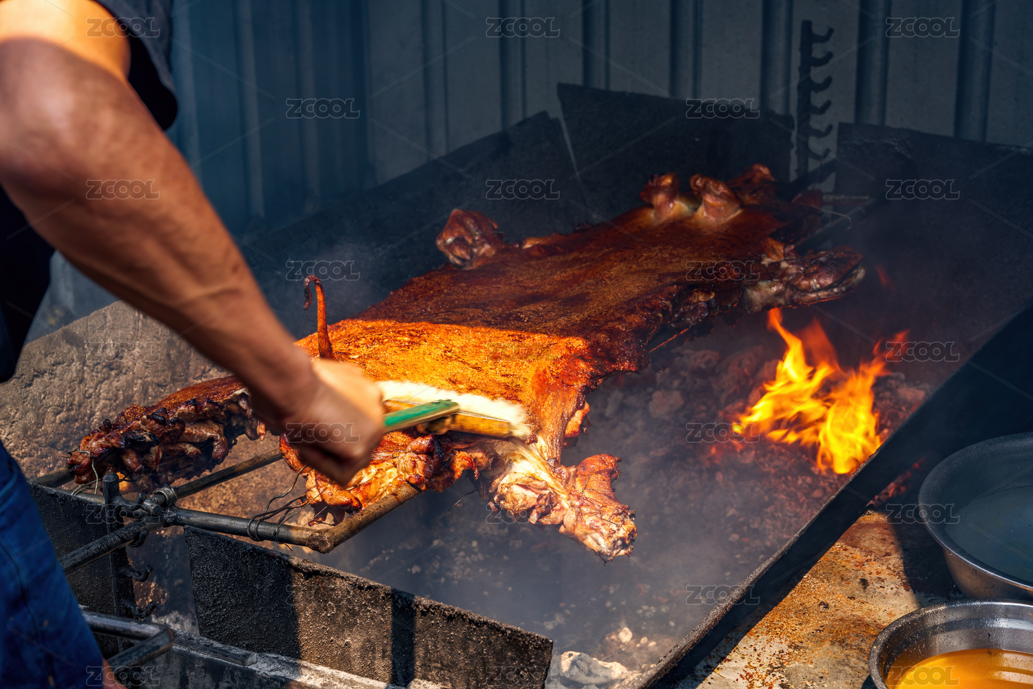 一整只在火炭上燒烤的脆皮香豬