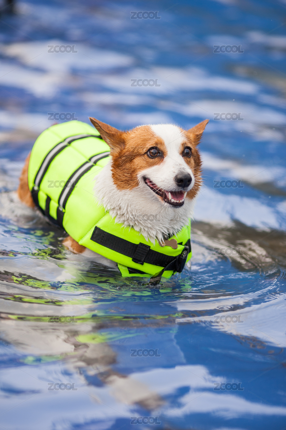 一只成年的威爾士柯基犬穿著救生衣在泳池游泳