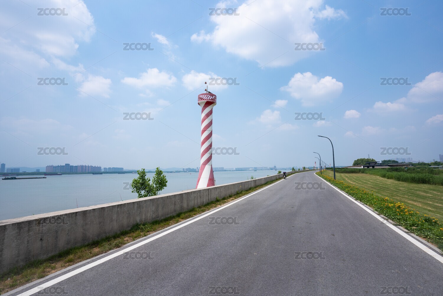南京長江邊的觀光道與江灘上紅白相間的燈塔