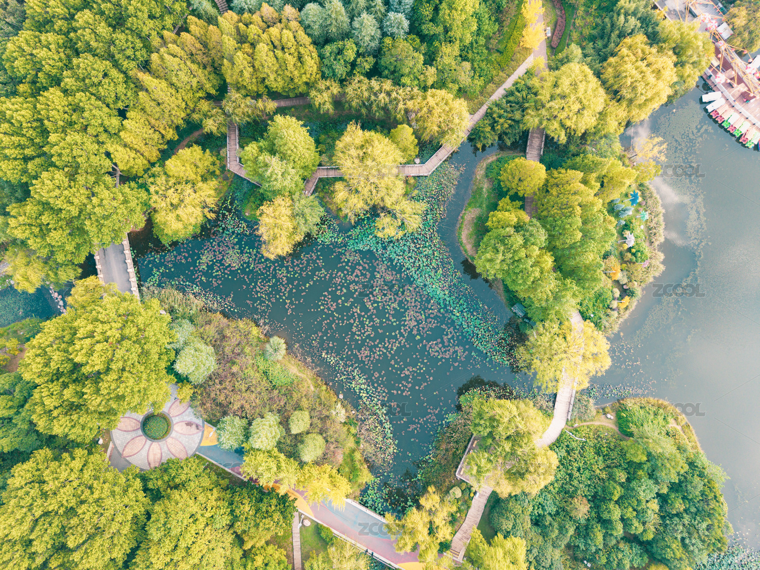 航拍城市綠地池塘景觀