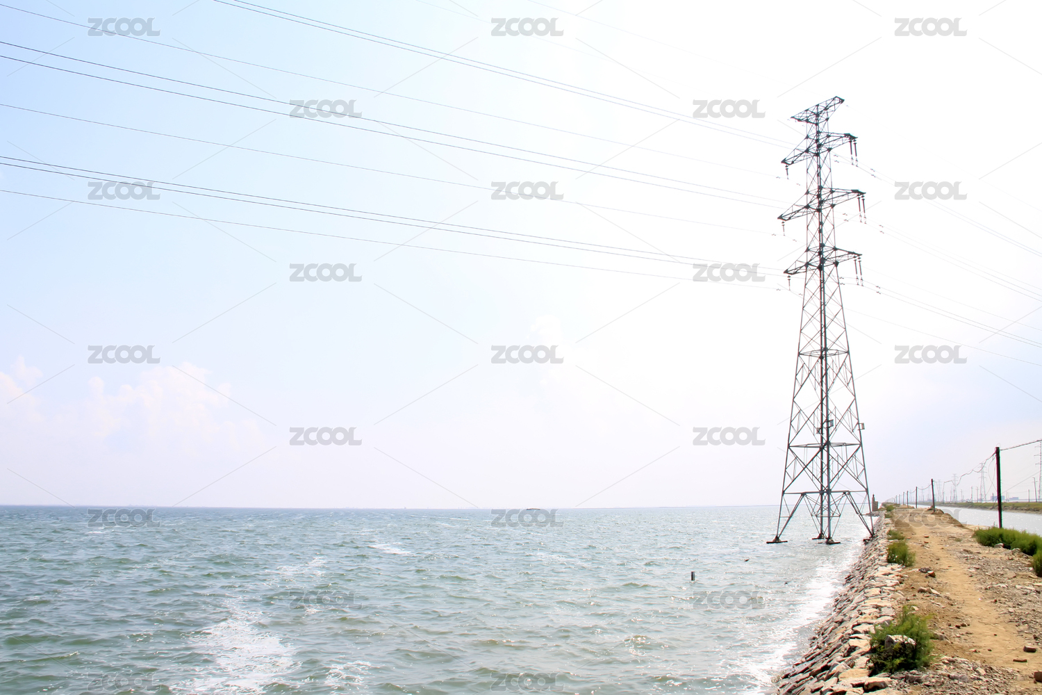 夕陽下渤海灘涂的高壓、超高壓輸電線路