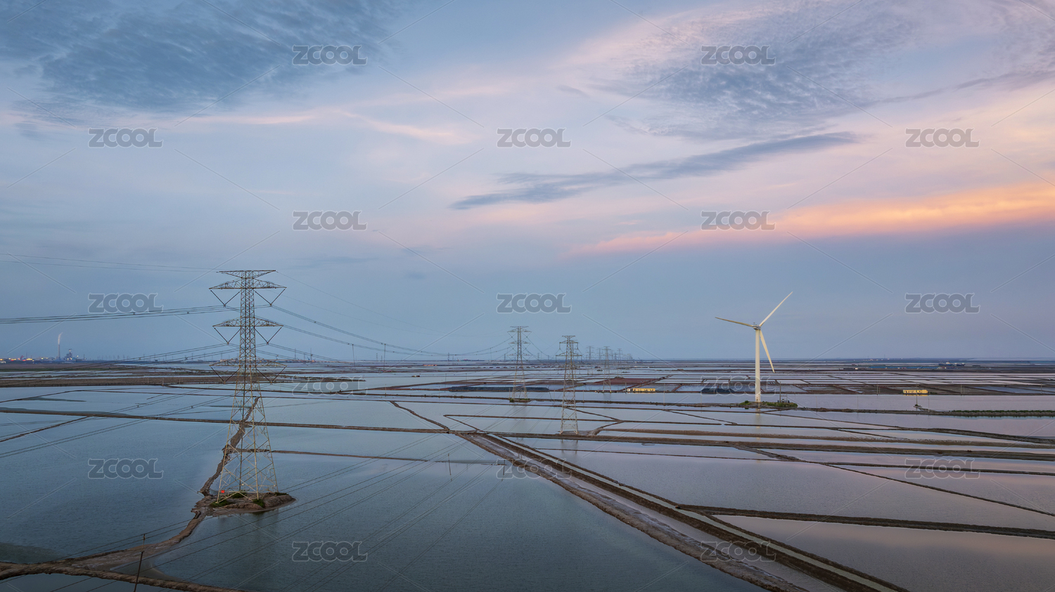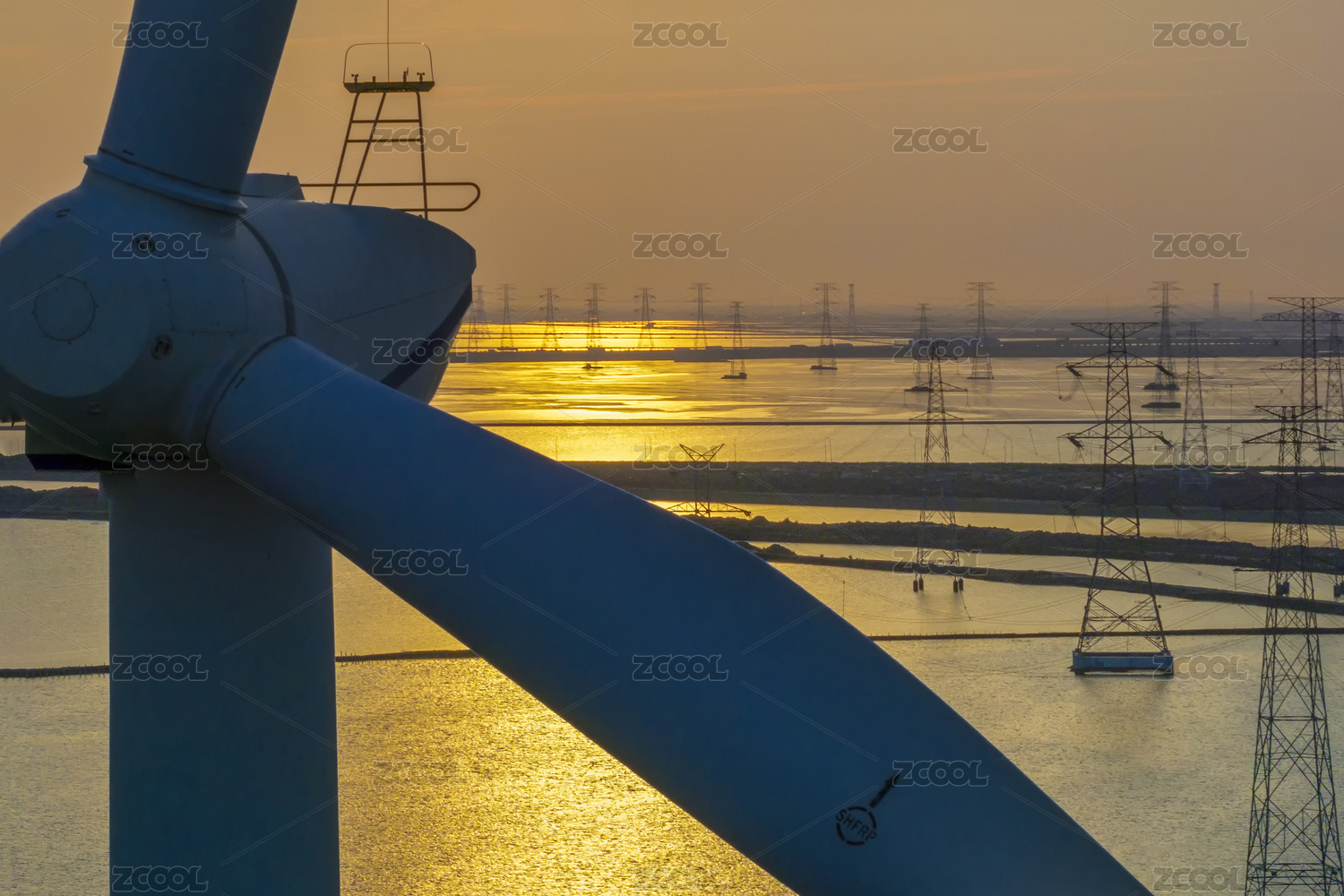 夕陽下渤海灘涂的風(fēng)電機(jī)組與輸電線路