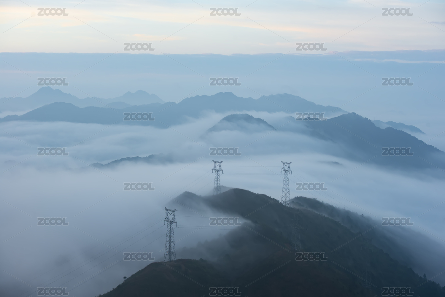 云海翻騰的群山之巔高壓輸電塔架若隱若現(xiàn)
