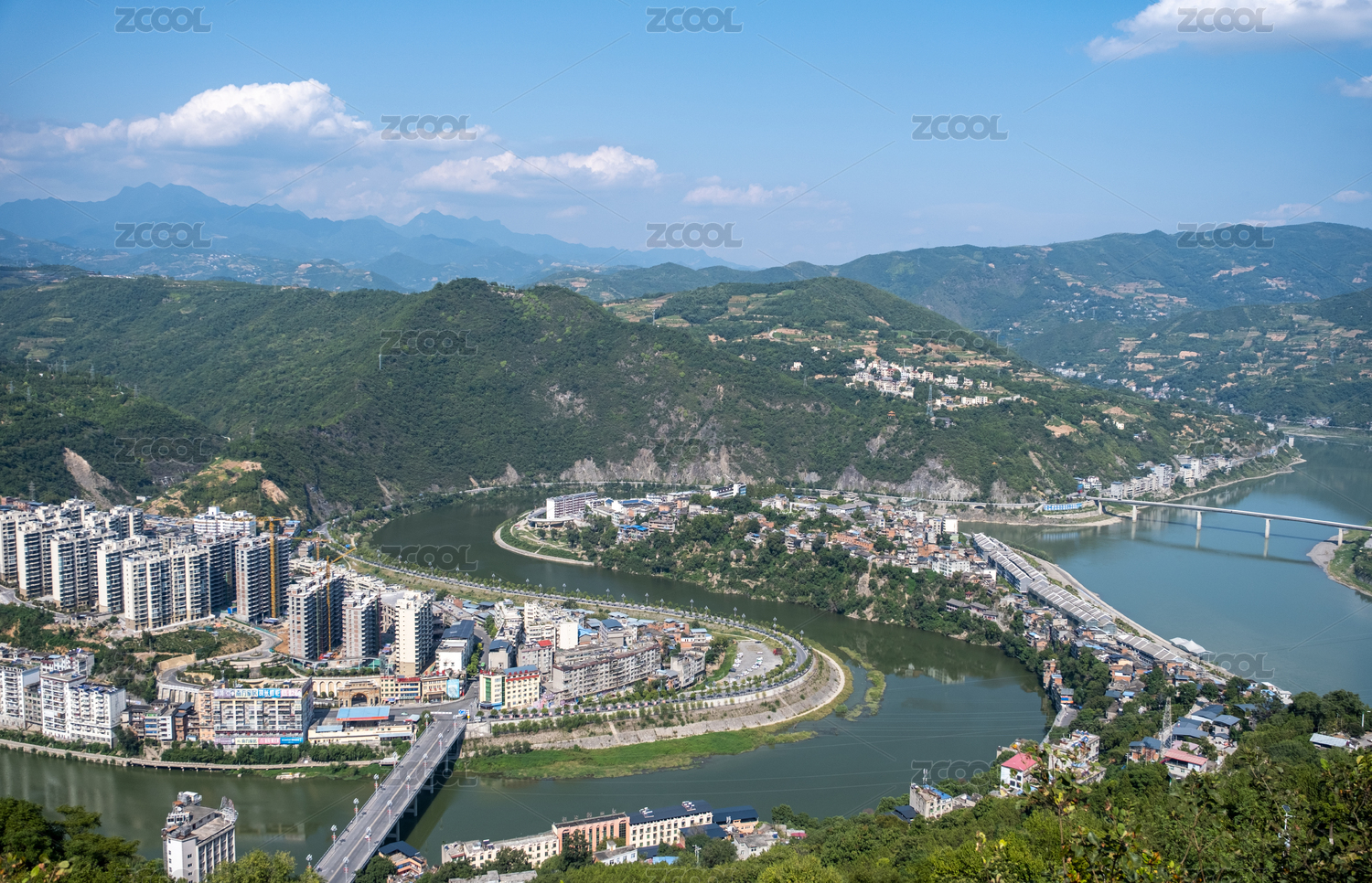 安康旬陽藍(lán)天白云下的秦嶺山脈