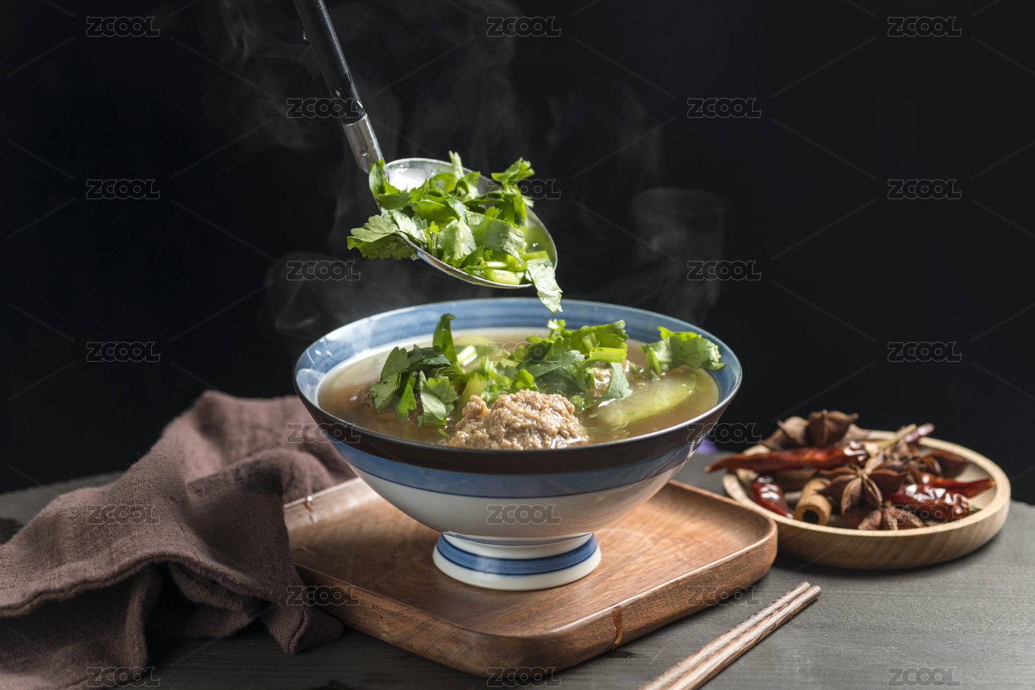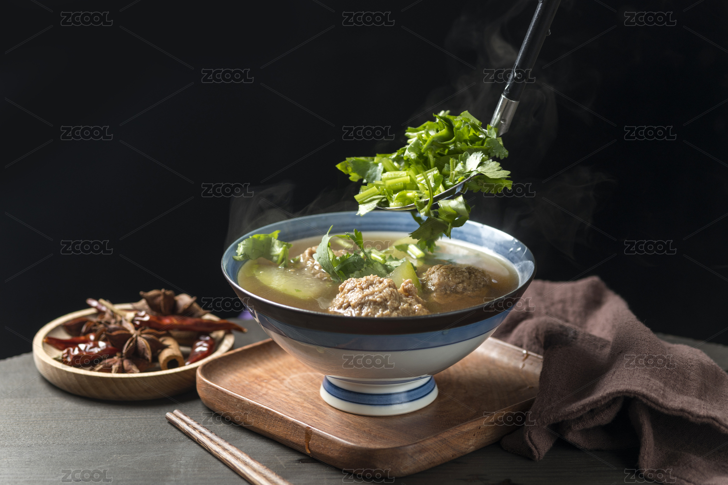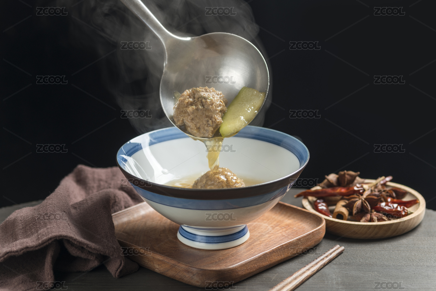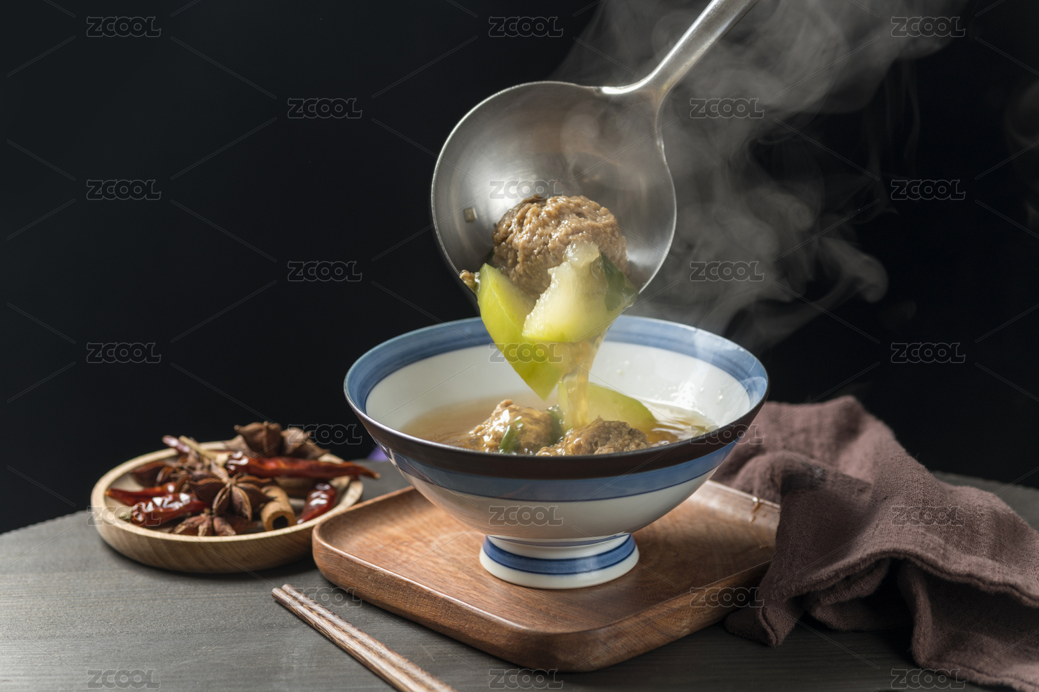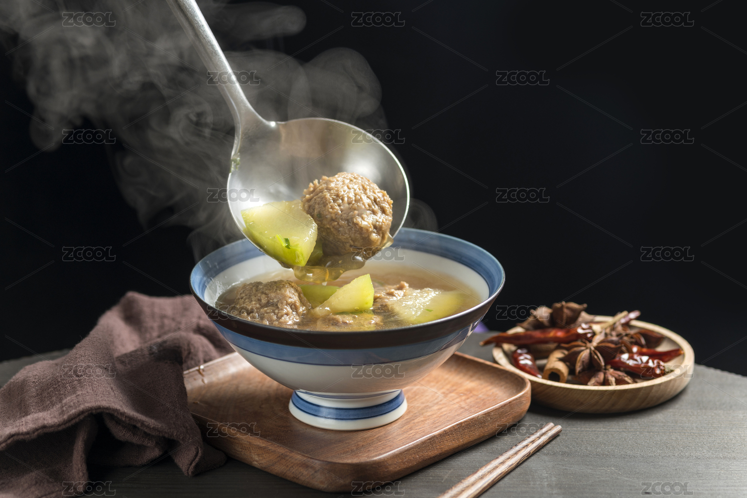 冬瓜丸子湯擺放在木桌面上特寫(xiě)