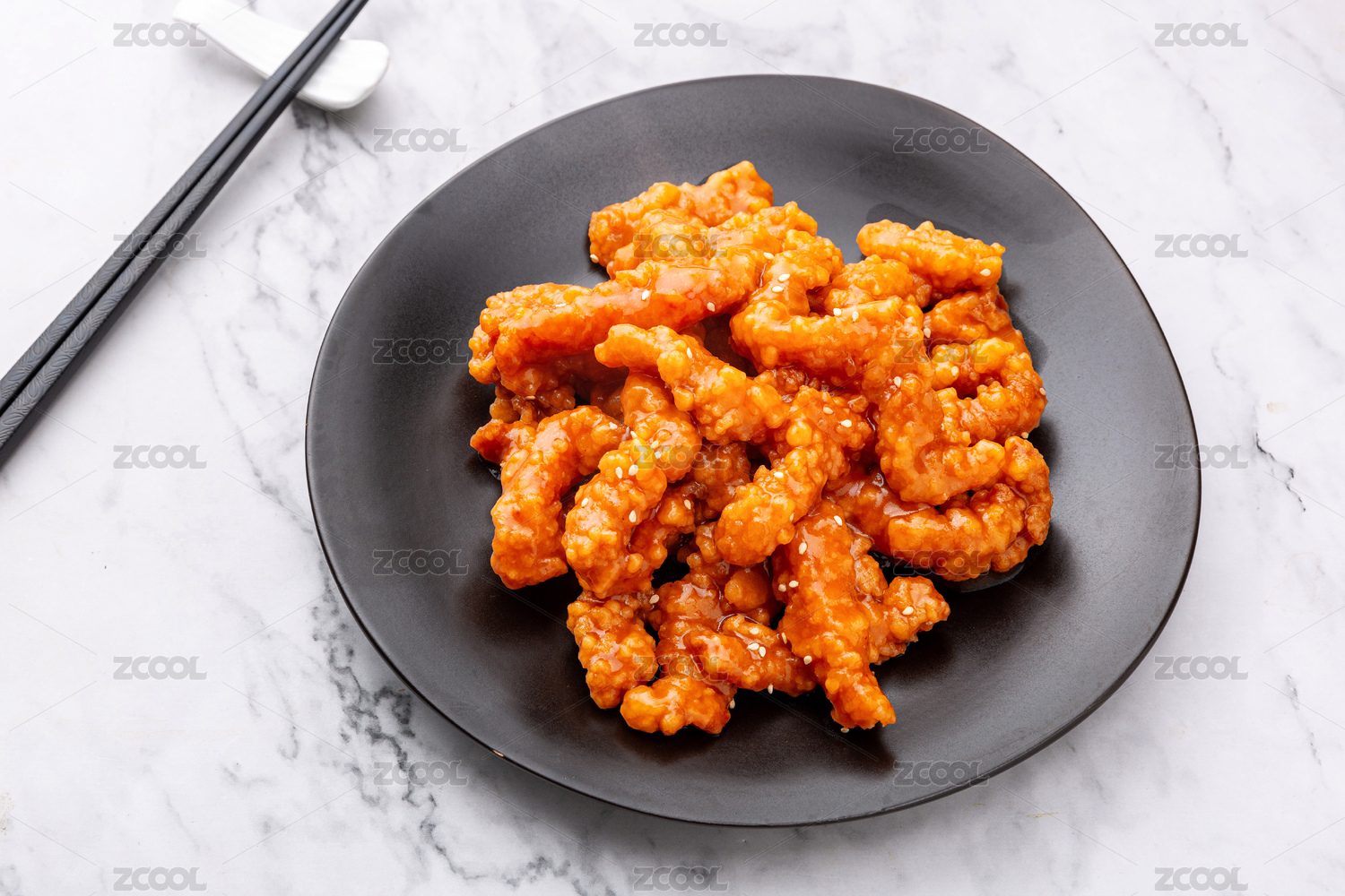 放在白色盤子上的中國(guó)菜——軟炸里脊,頂拍視角