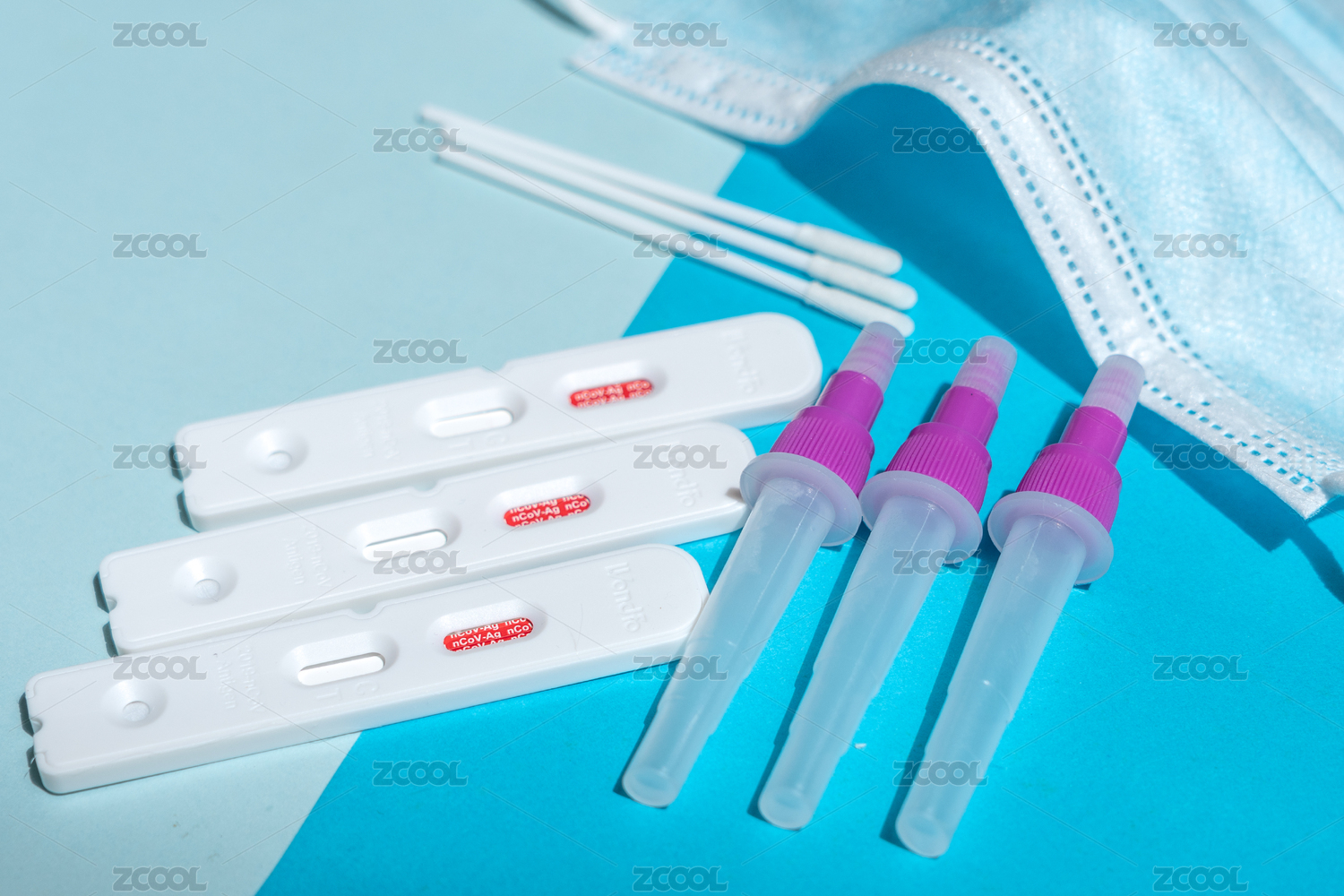 藍色背景上口罩下的核酸檢測抗原檢測試劑