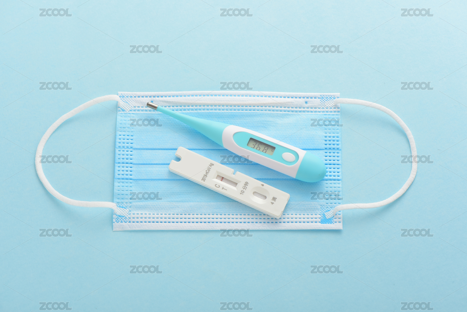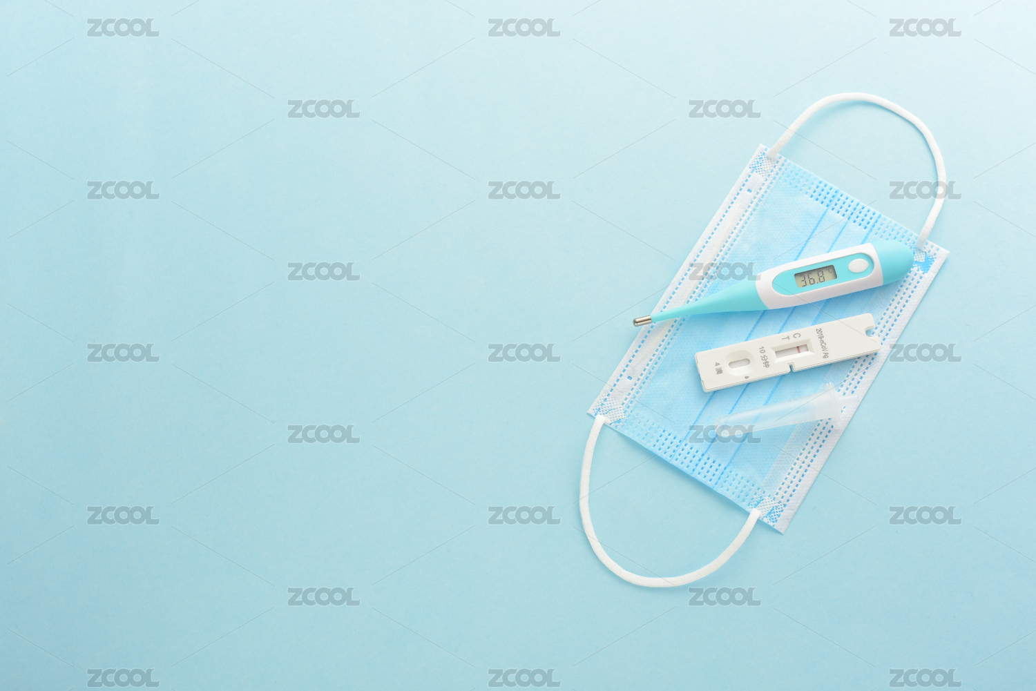 藍色背景上的抗原檢測試劑、口罩和體溫計