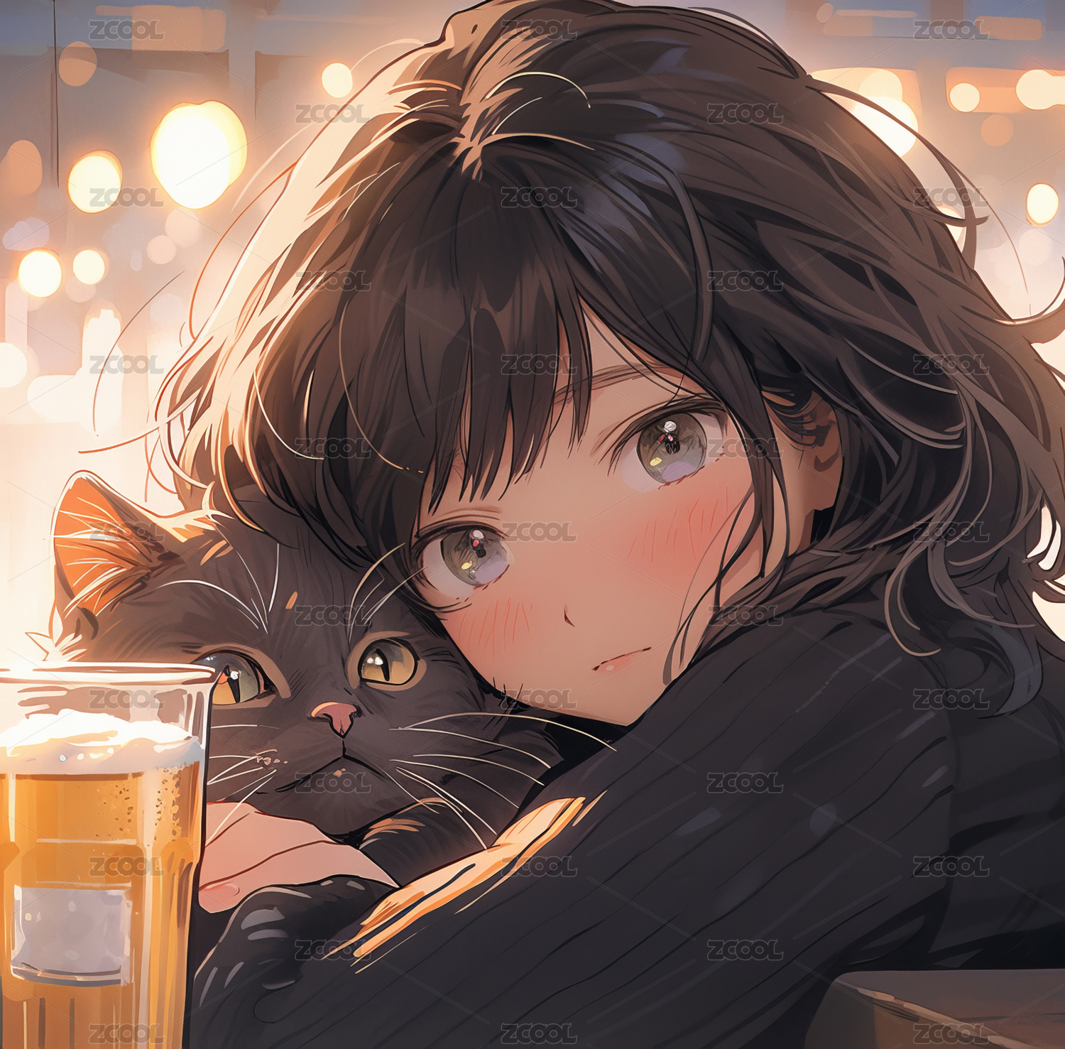 女孩抱著小貓在喝啤酒
