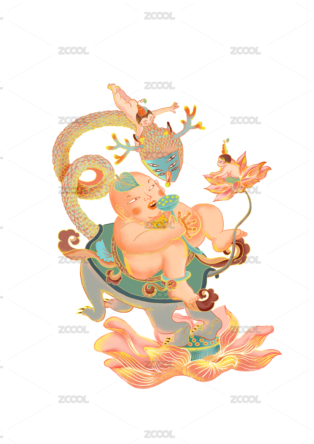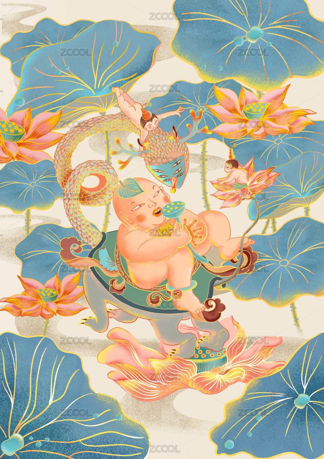 國風蓮花異獸蓮子福娃嬉戲