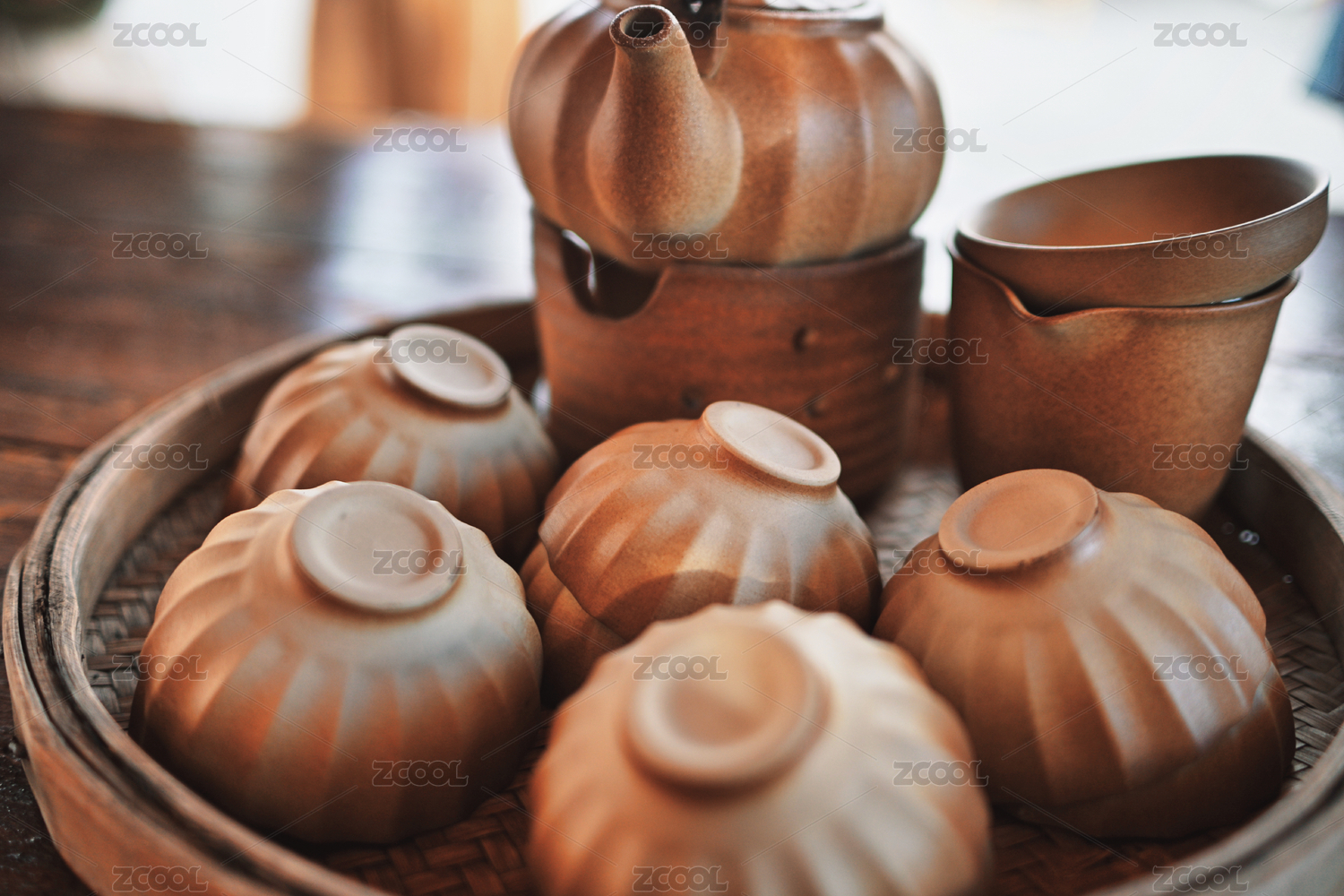 古樸陶器茶具靜置竹盤