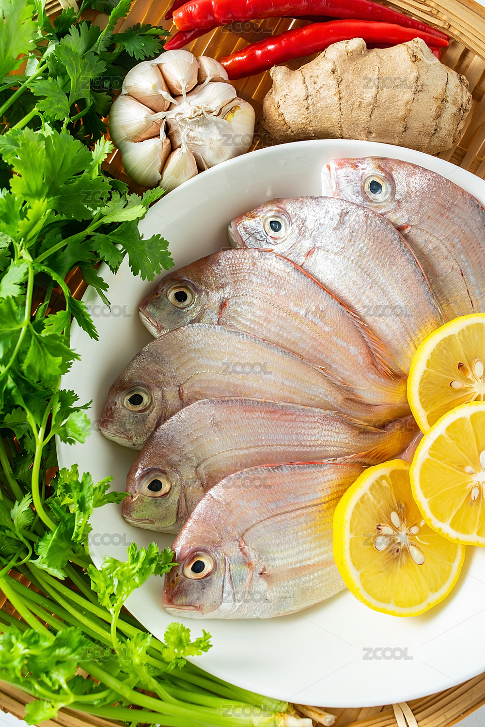 白背景上一竹盤裝著新鮮紅鯛魚和香料食材