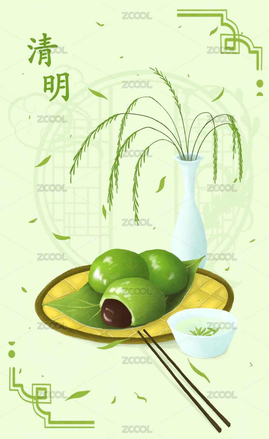 有清茶玉瓶柳枝綠色青團黃色竹盤筷子的清明
