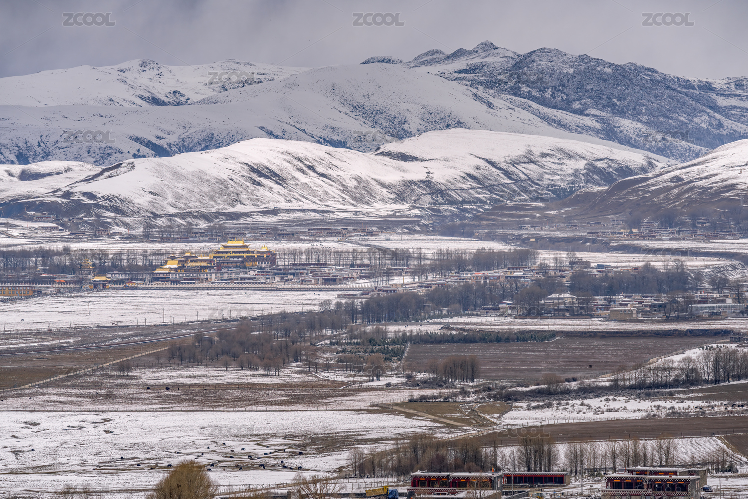 青海省西寧市向化藏族鄉(xiāng)雪山下的寧靜村莊