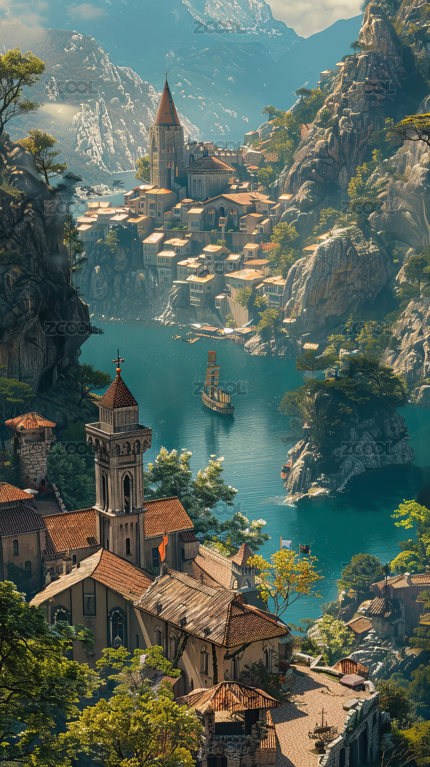 山間湖泊旁的古老村莊