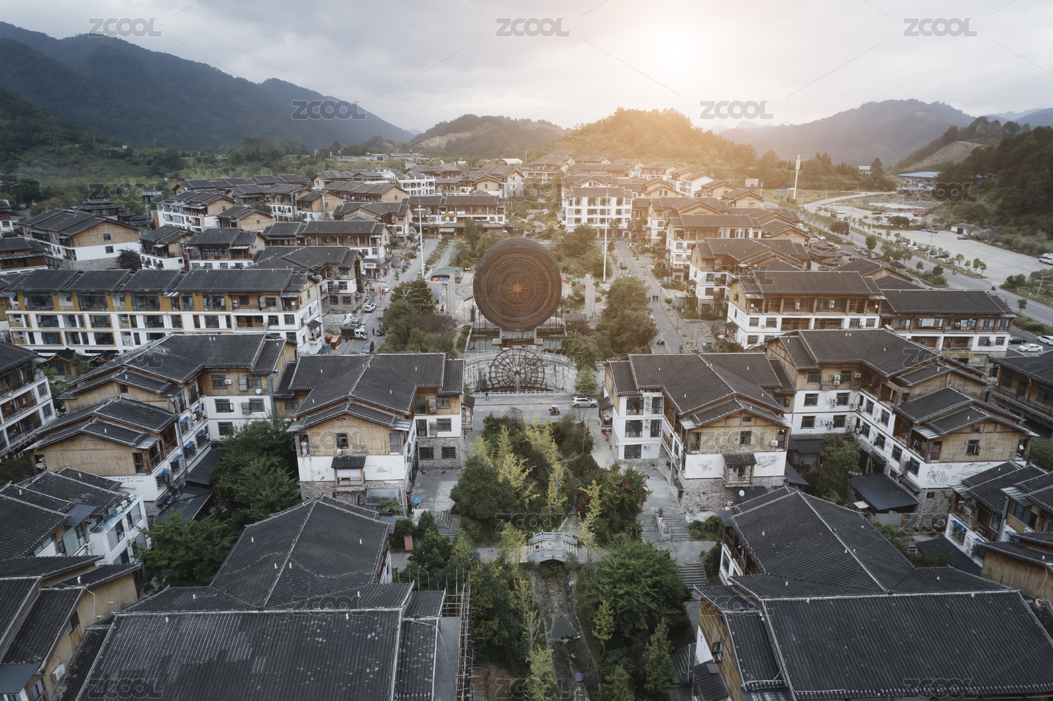 日落時分群山環(huán)繞的寧靜村莊鳥瞰圖
