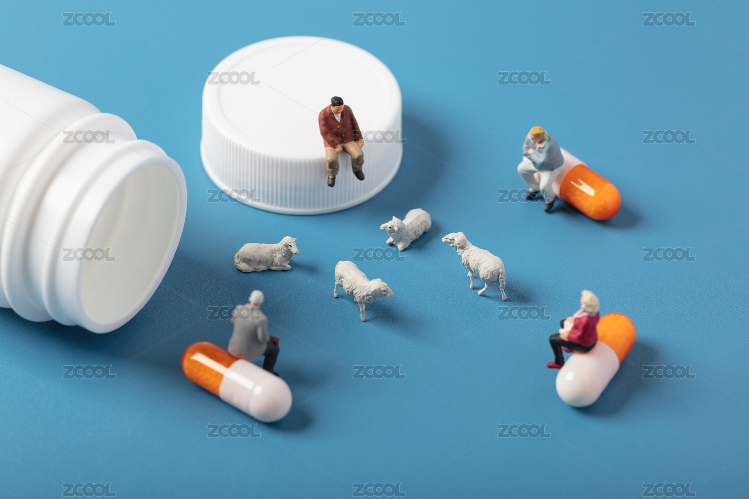 創(chuàng)意微縮藍色背景坐在藥瓶旁邊的病人