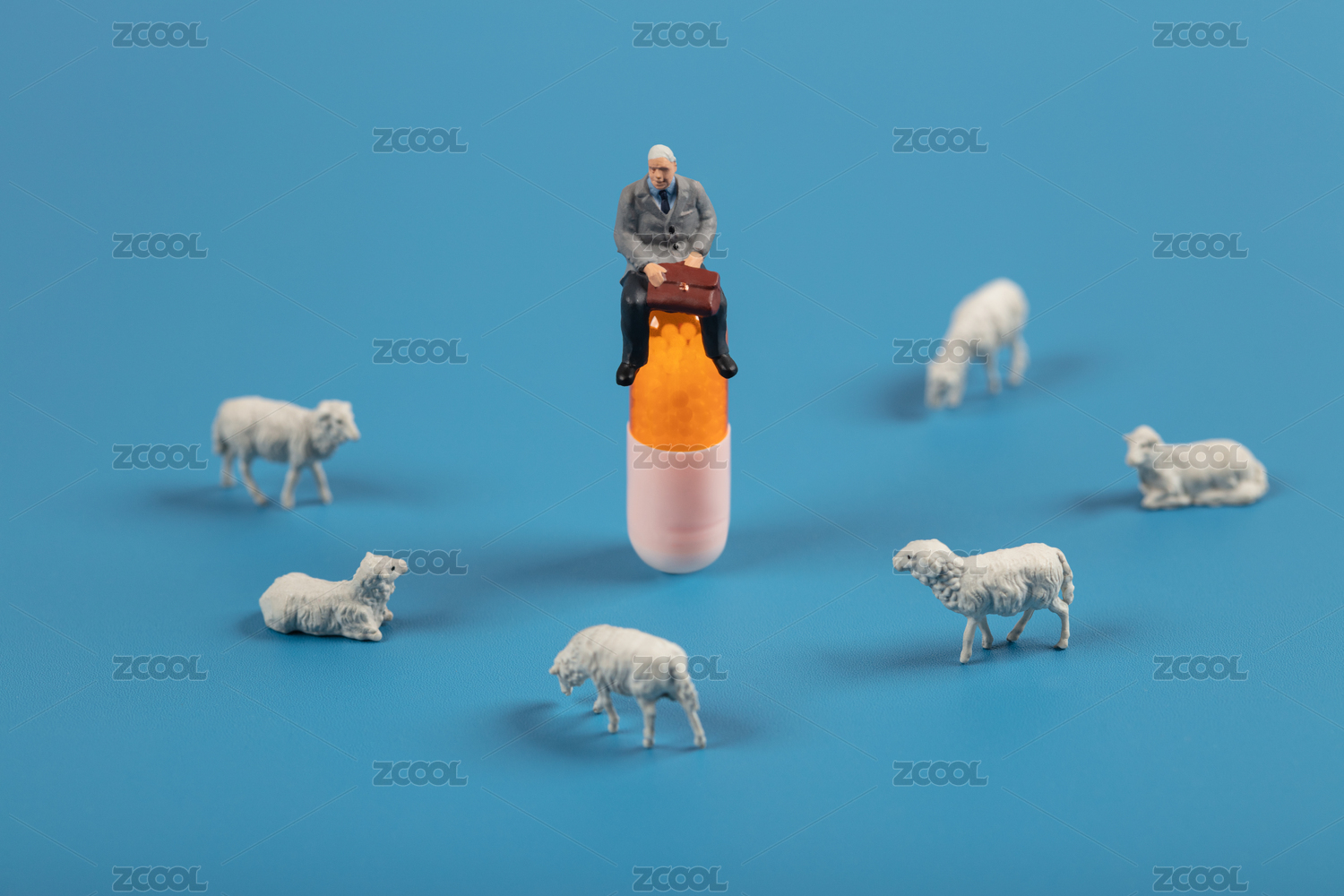 創(chuàng)意微縮藍色背景站在羊群中父子