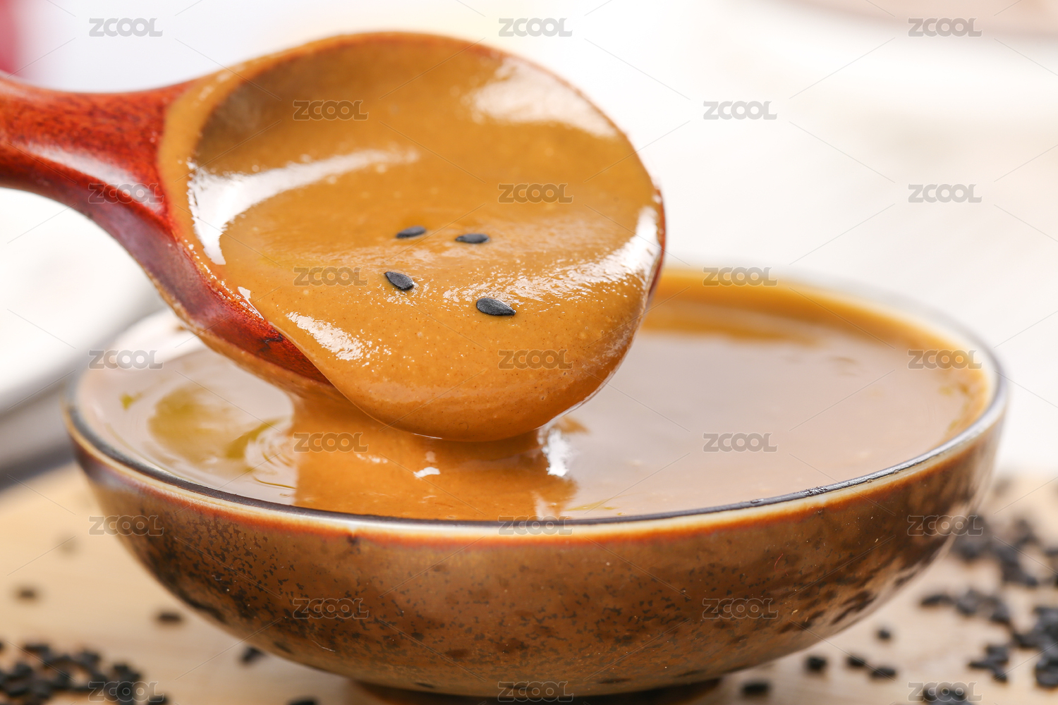 一碗芝麻醬和勺子上挖著醬料