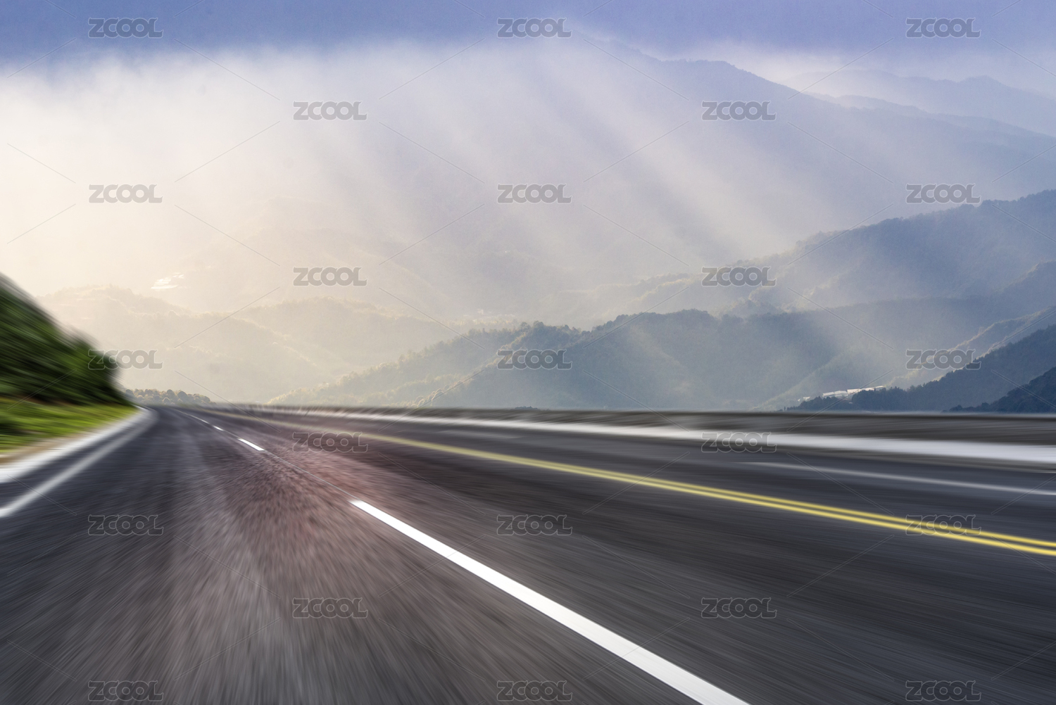 一條動感柏油路從有丁達爾現(xiàn)象光線的群山前穿過,中國福建龍巖