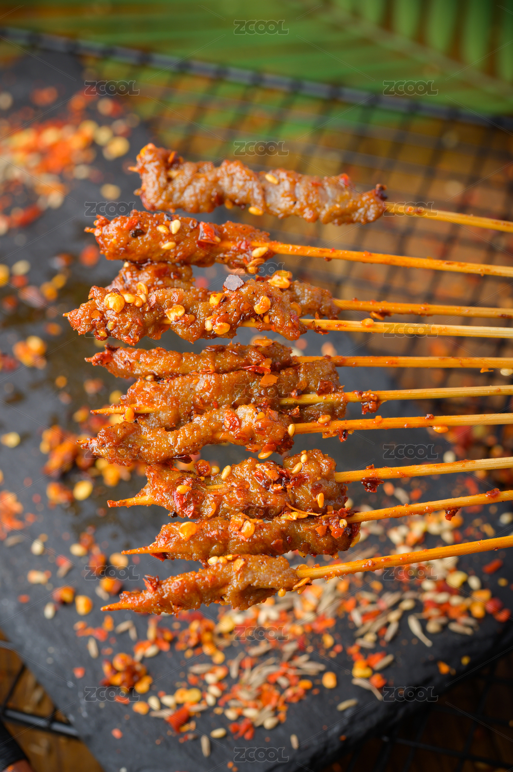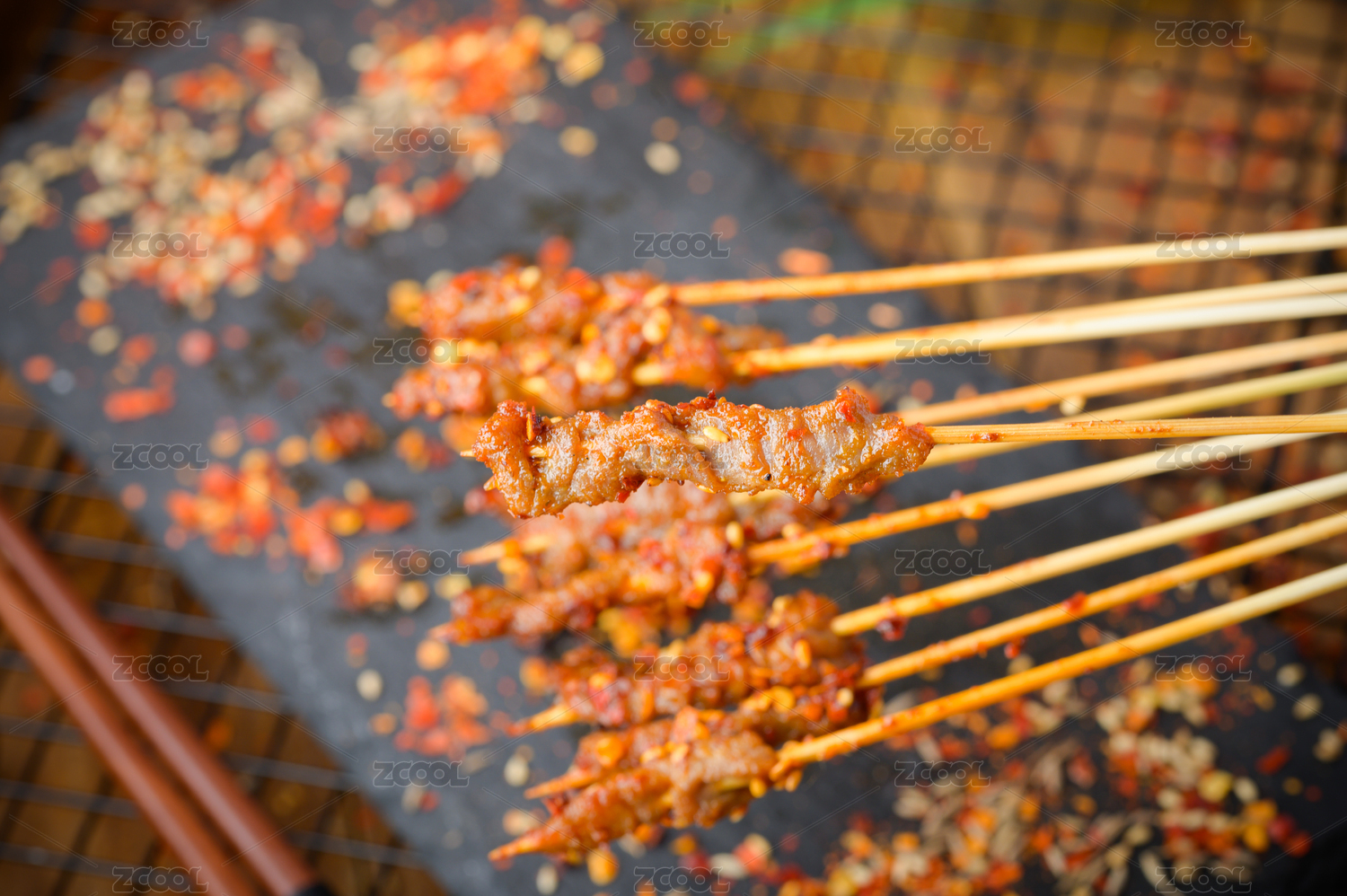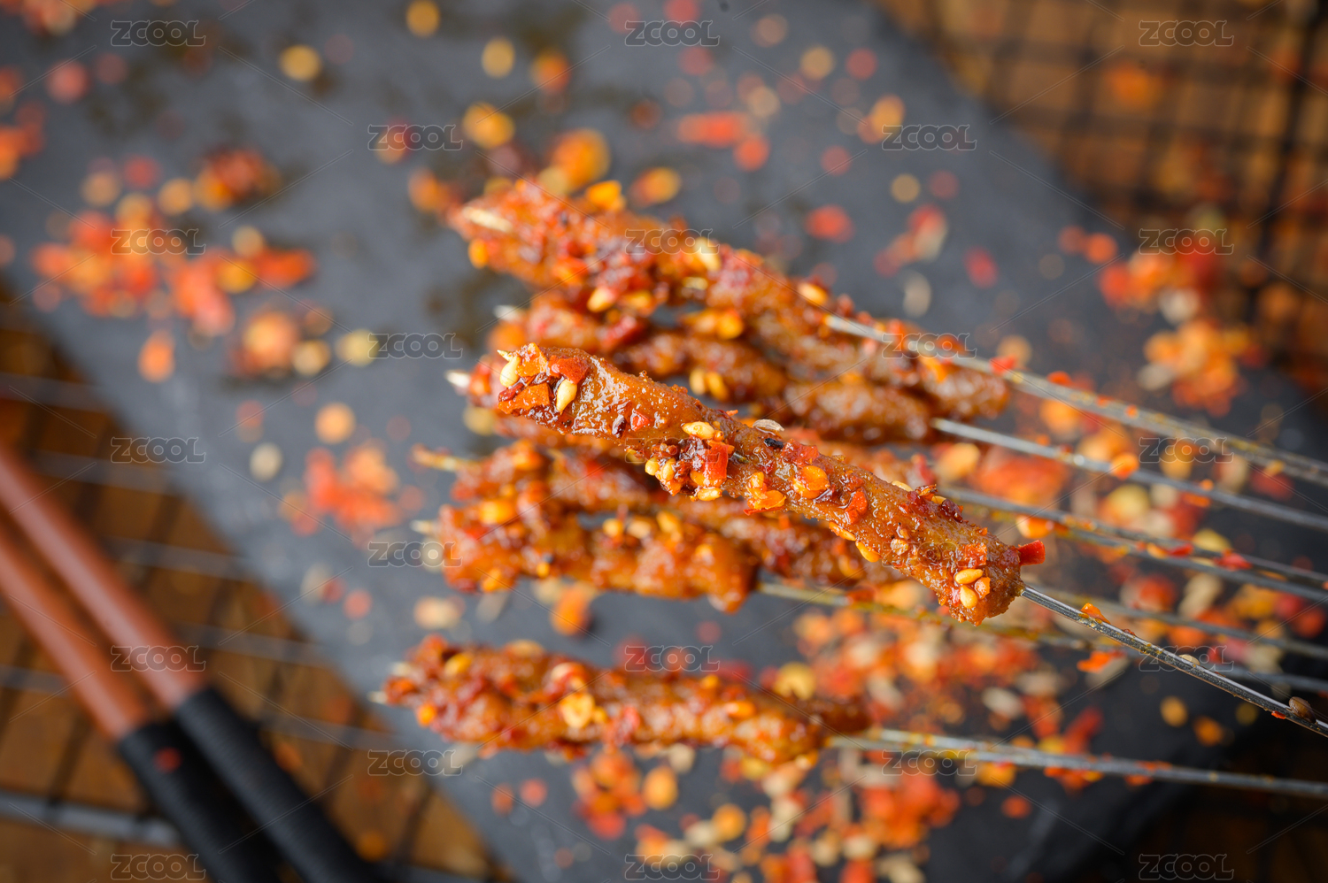 黑色烤架上放著幾串撒著辣椒面的油炸肉筋