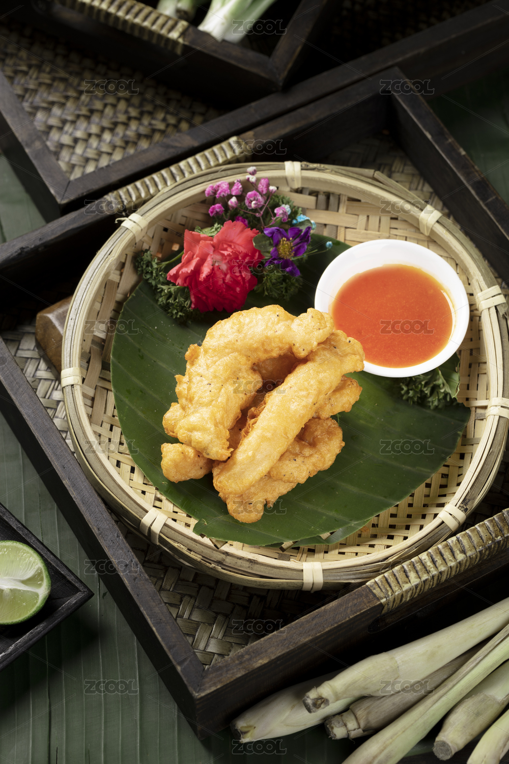 芭蕉葉上竹編小筲箕里的越南料理油炸肉條
