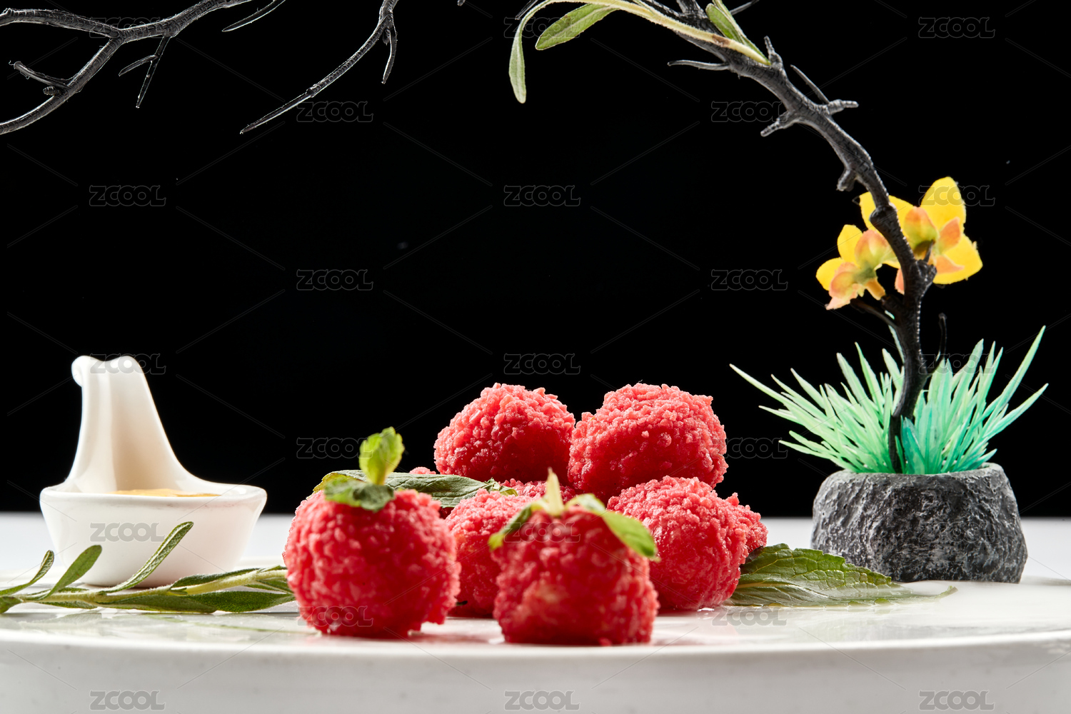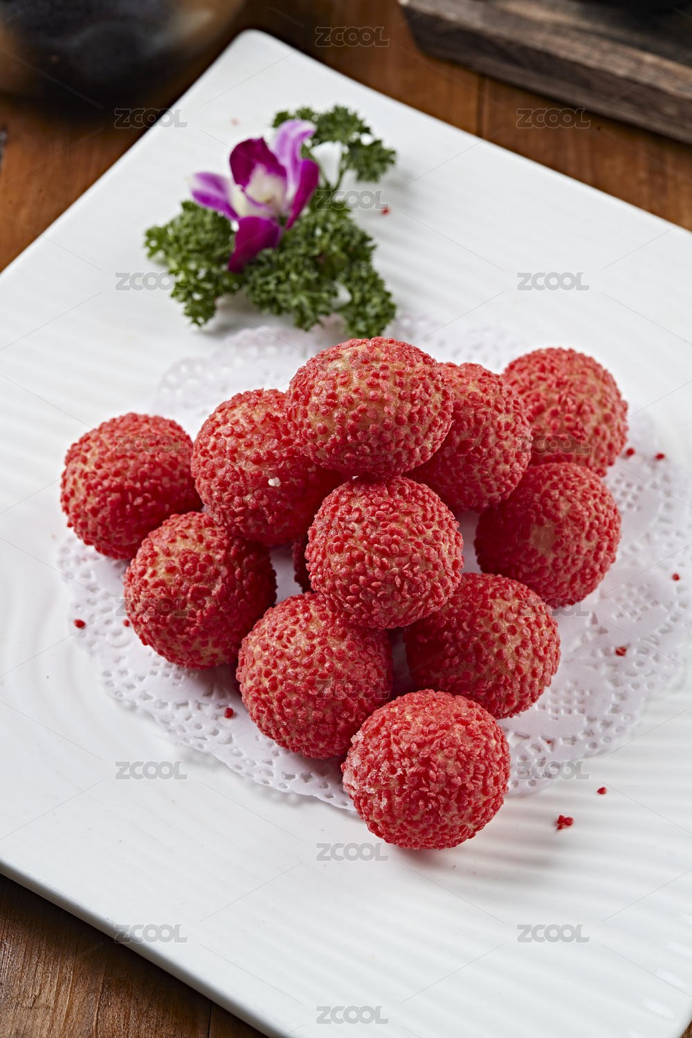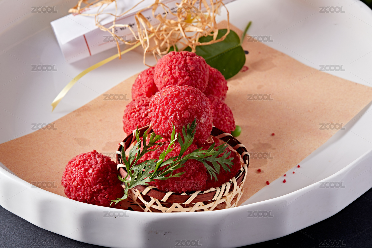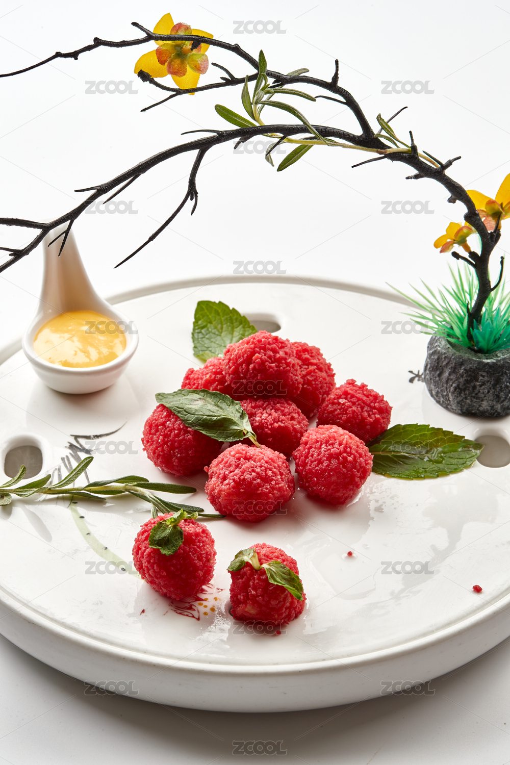 白瓷盤(pán)裝的精美擺盤(pán)的荔枝大蝦球