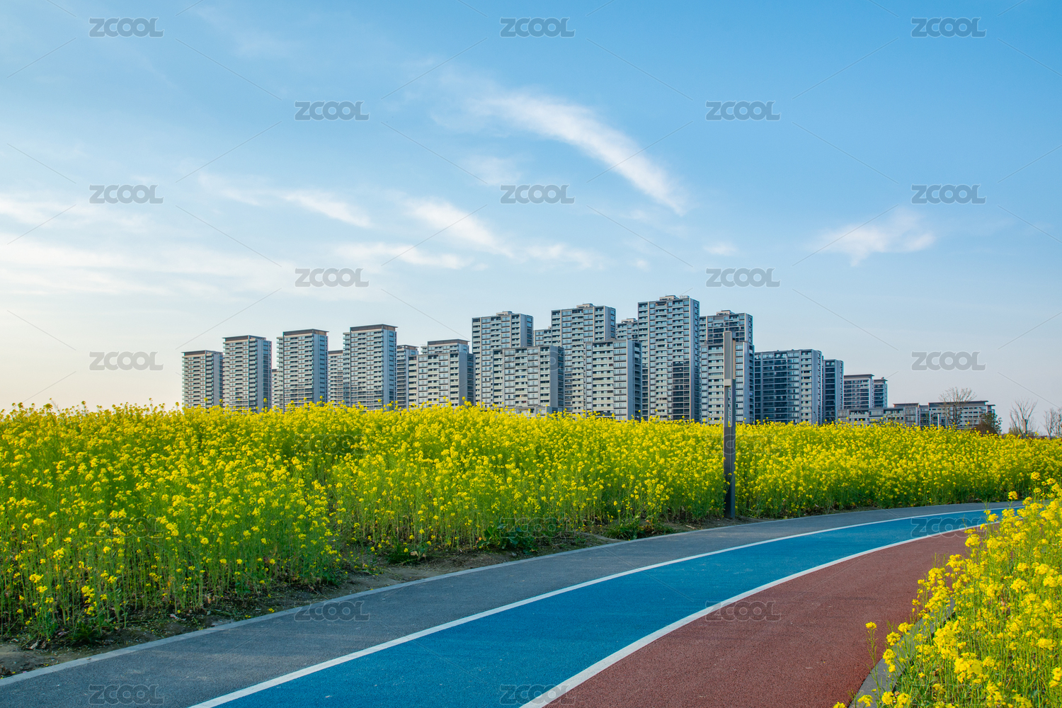 杭州錢塘區(qū)東沙湖公園油菜花海的橡膠跑道