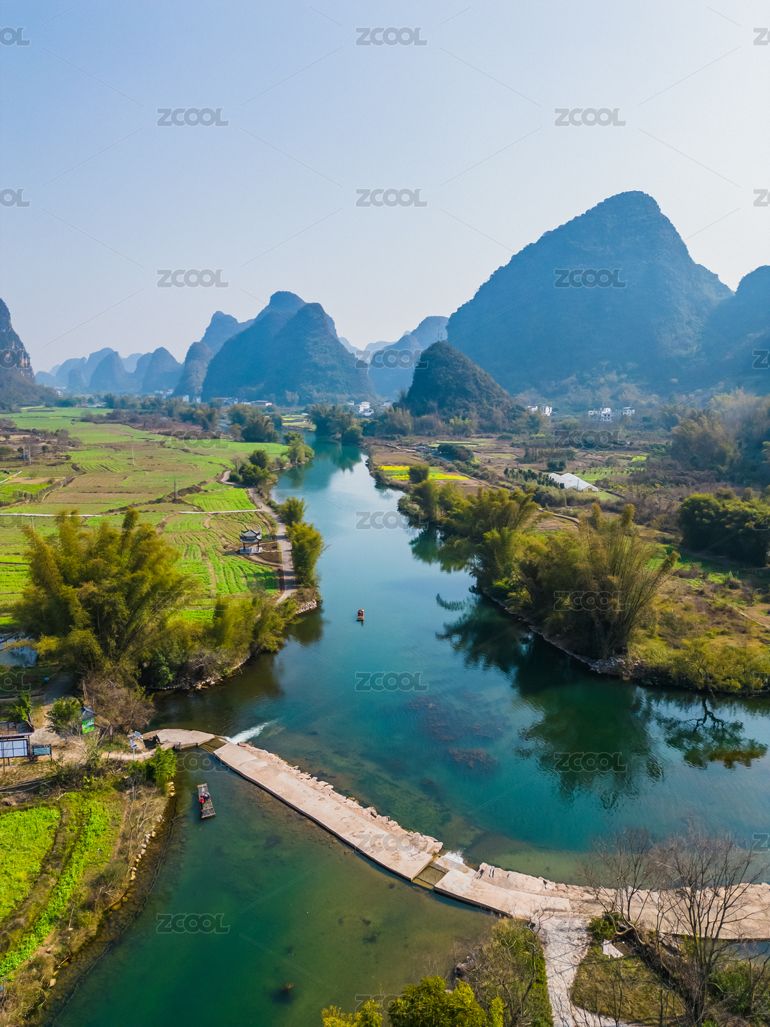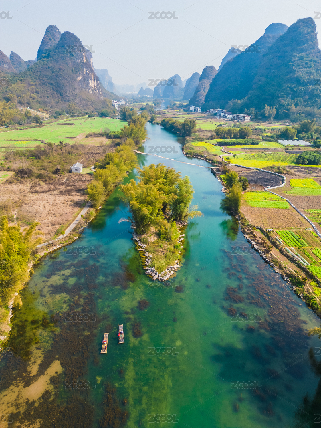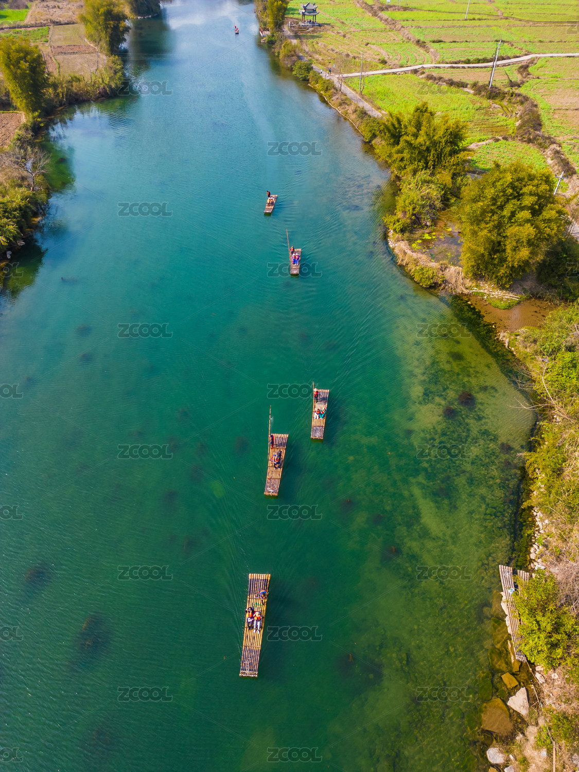 廣西桂林陽朔遇龍河兩岸竹筏漂流航拍自然風