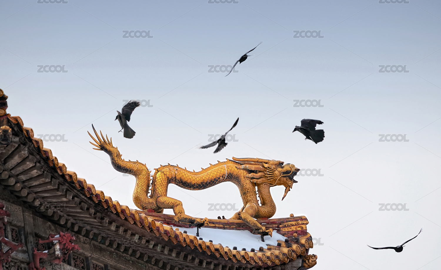 雪中故宮里宮殿上的銅龍與烏鴉