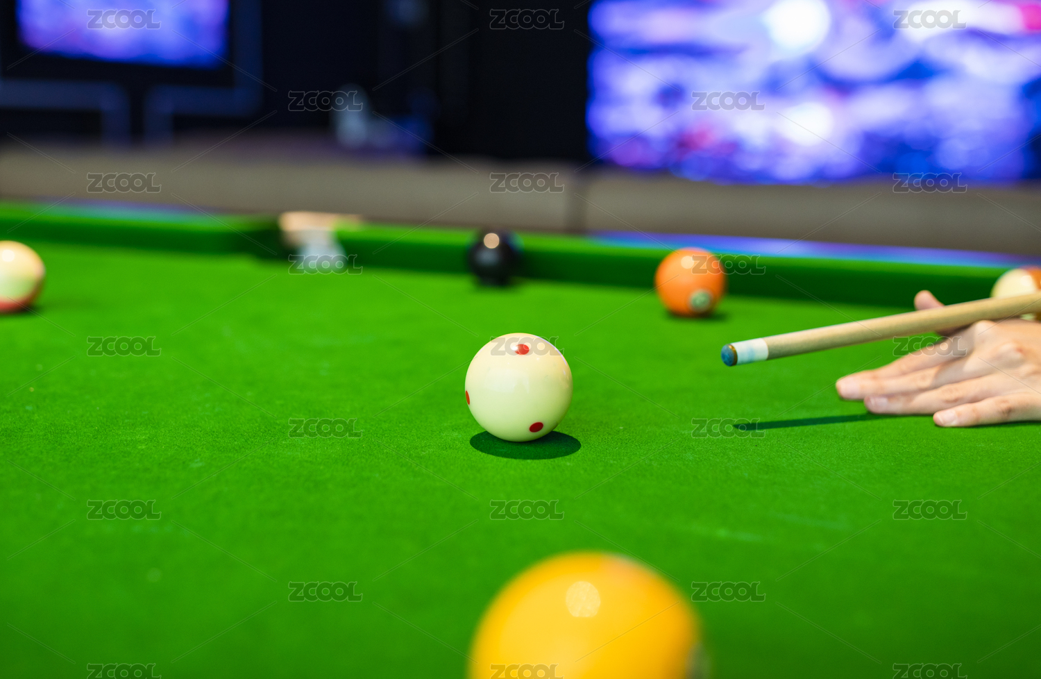 綠色臺(tái)球桌上打桌球的手