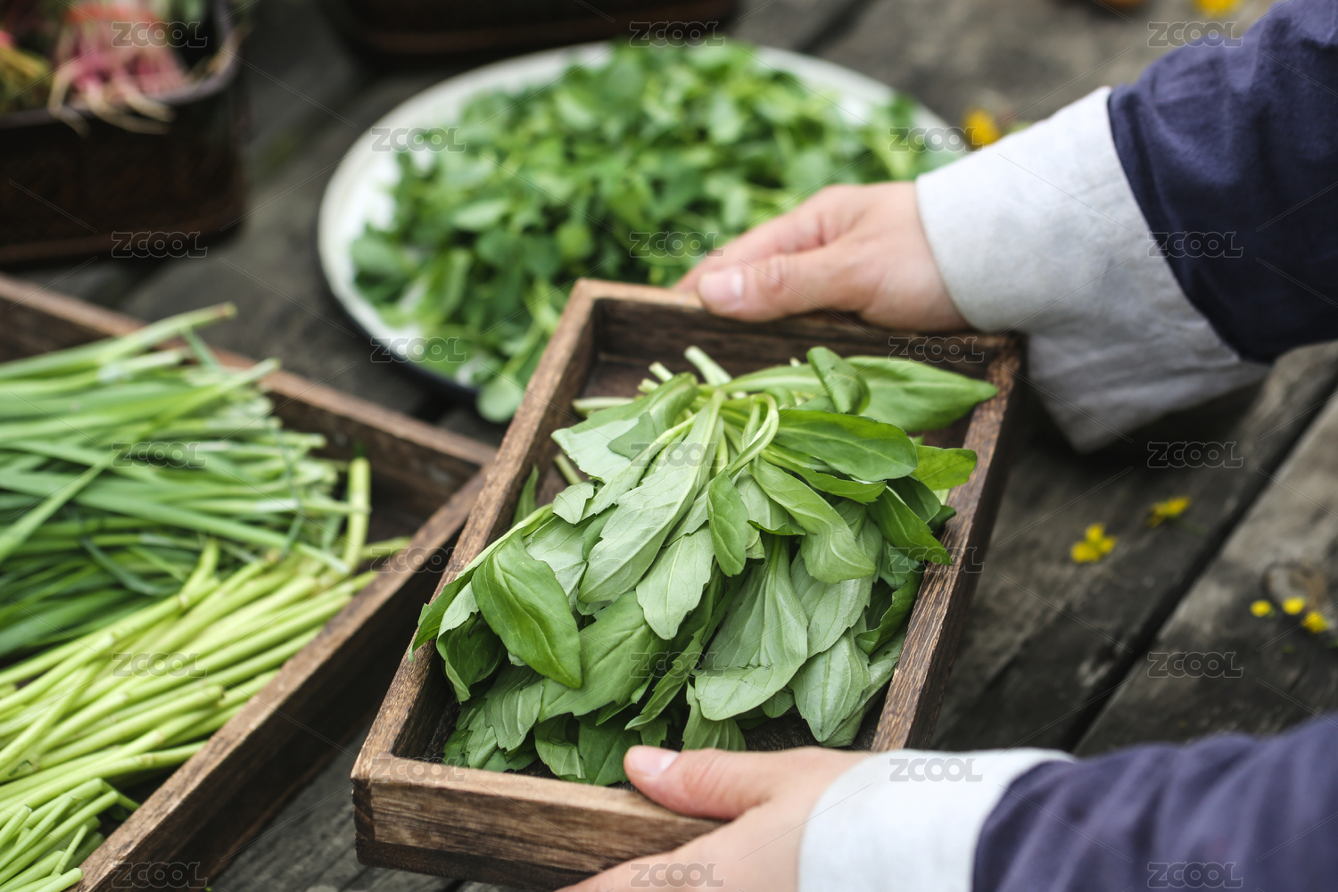 古樸的餐桌上端起一盤(pán)新鮮的野菜馬蘭頭