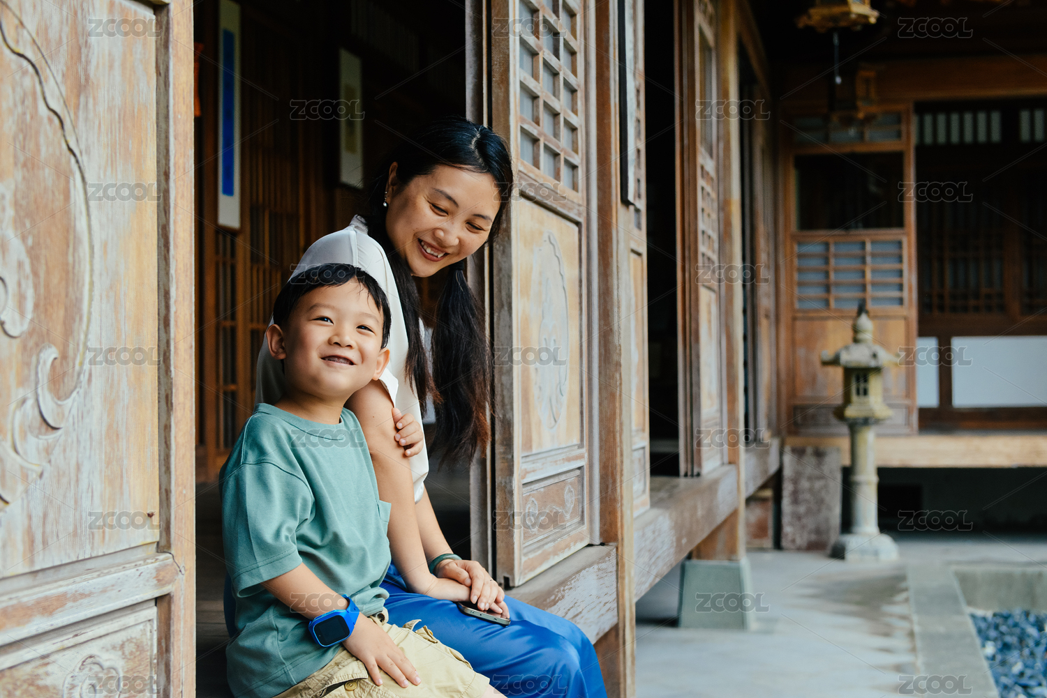 中國母親與孩子在天臺縣石梁鎮(zhèn)通玄寺古建筑