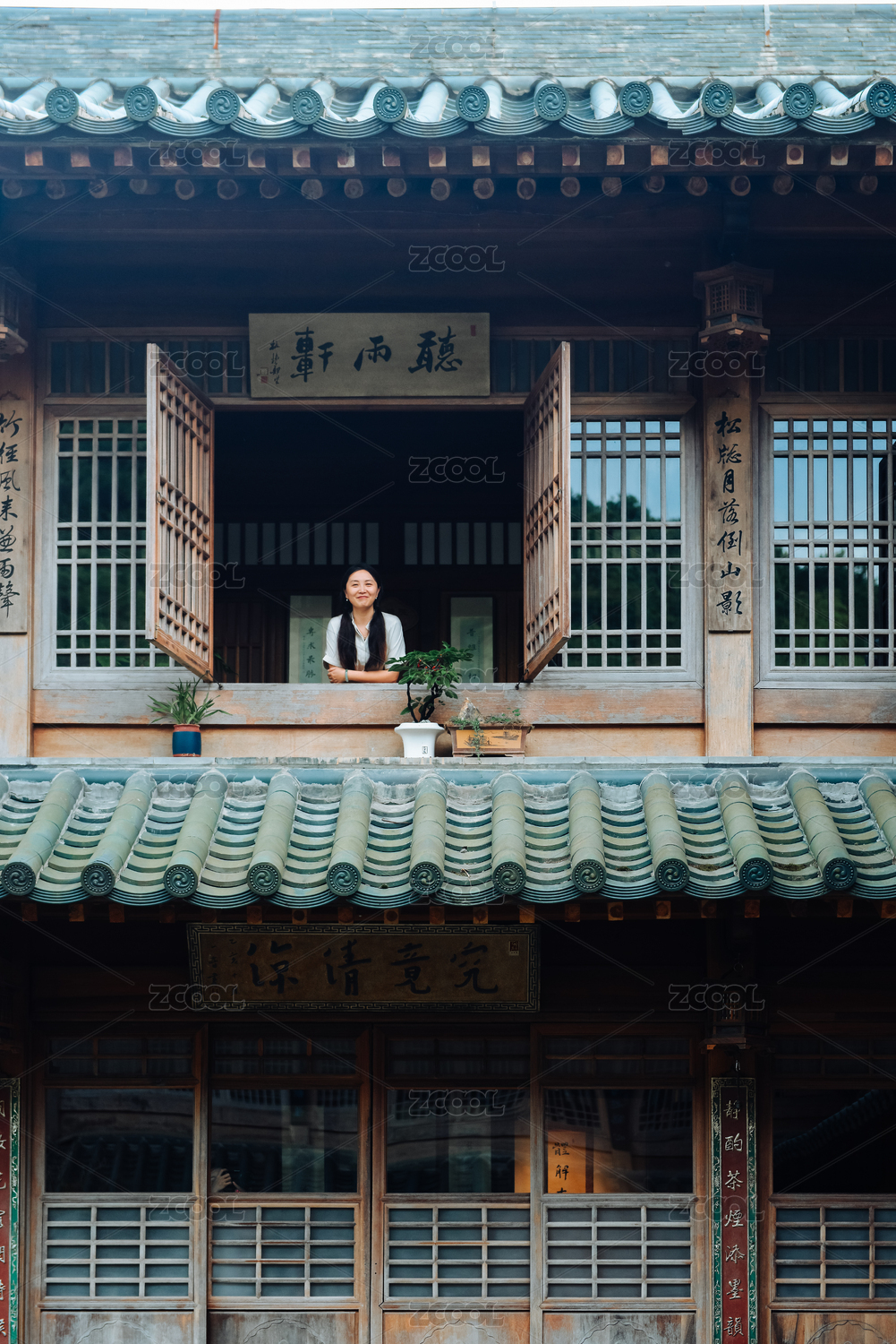 中國女性在天臺縣石梁鎮(zhèn)通玄寺古建筑中游玩