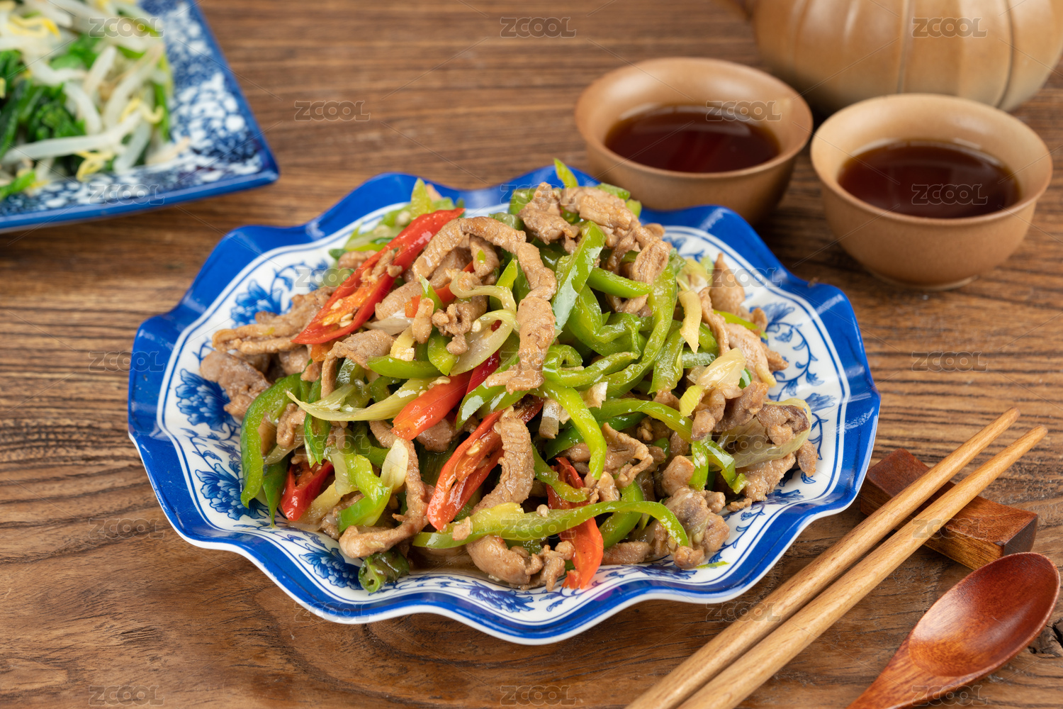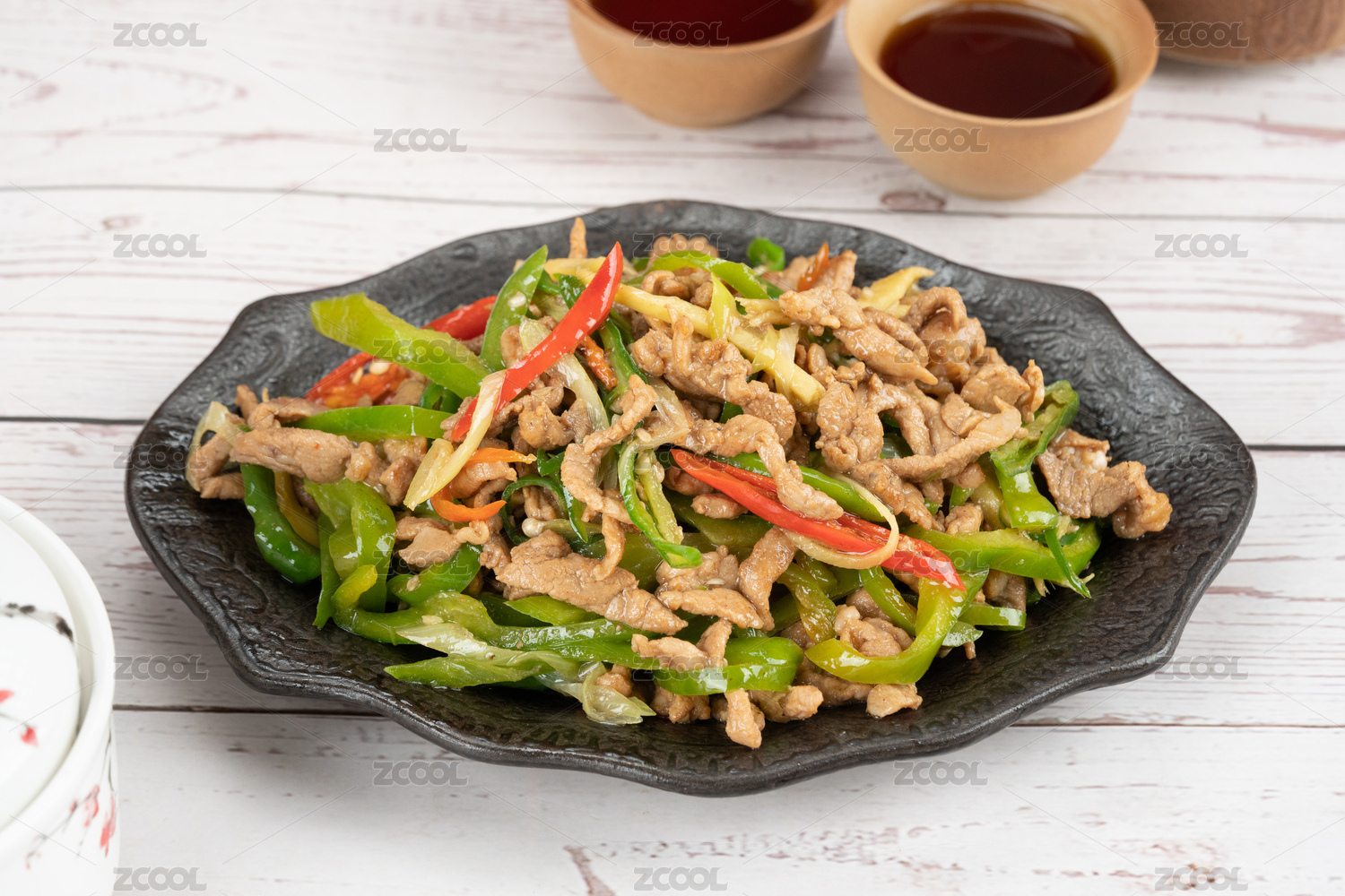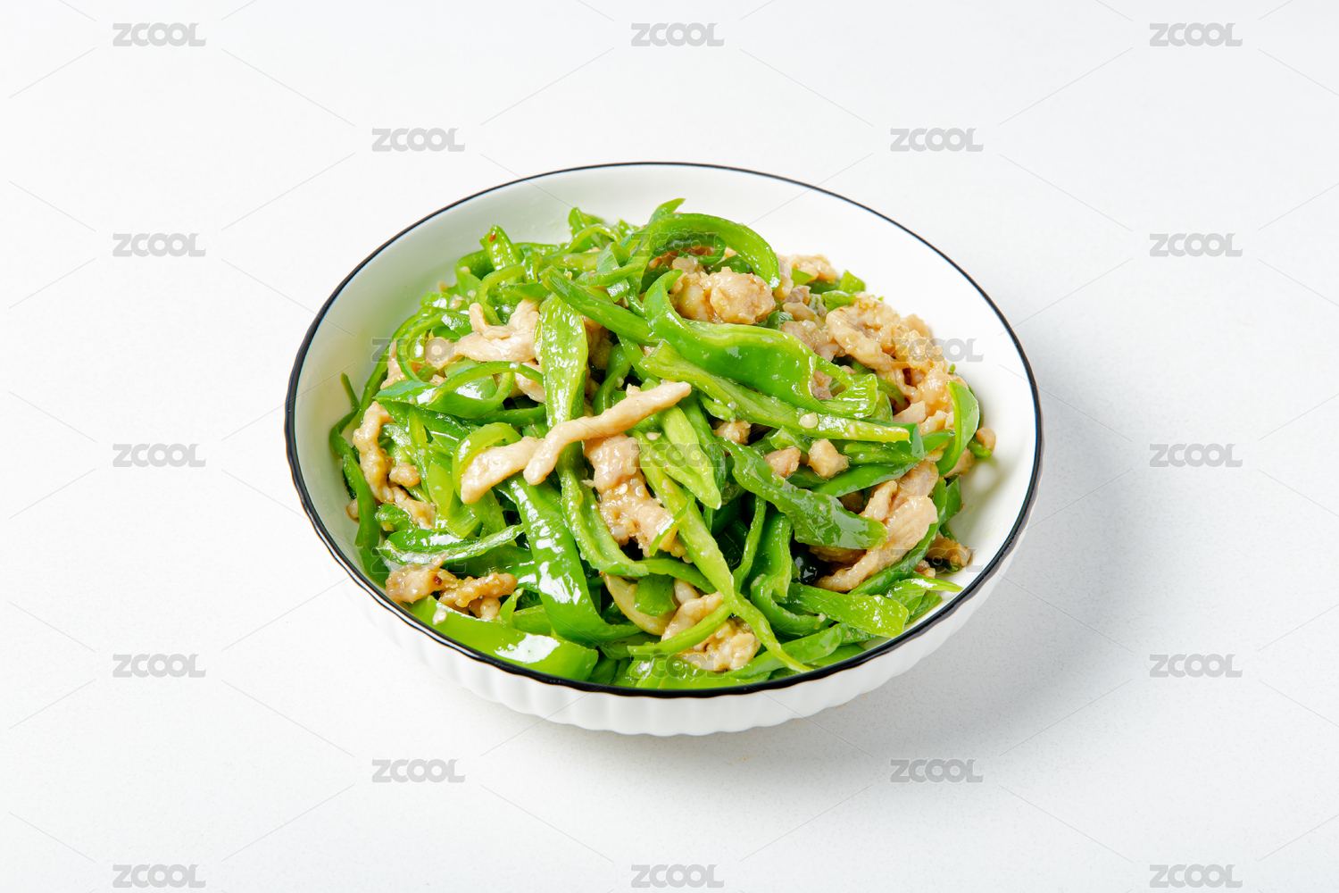 木紋背景碗里的青椒炒肉絲蓋澆飯