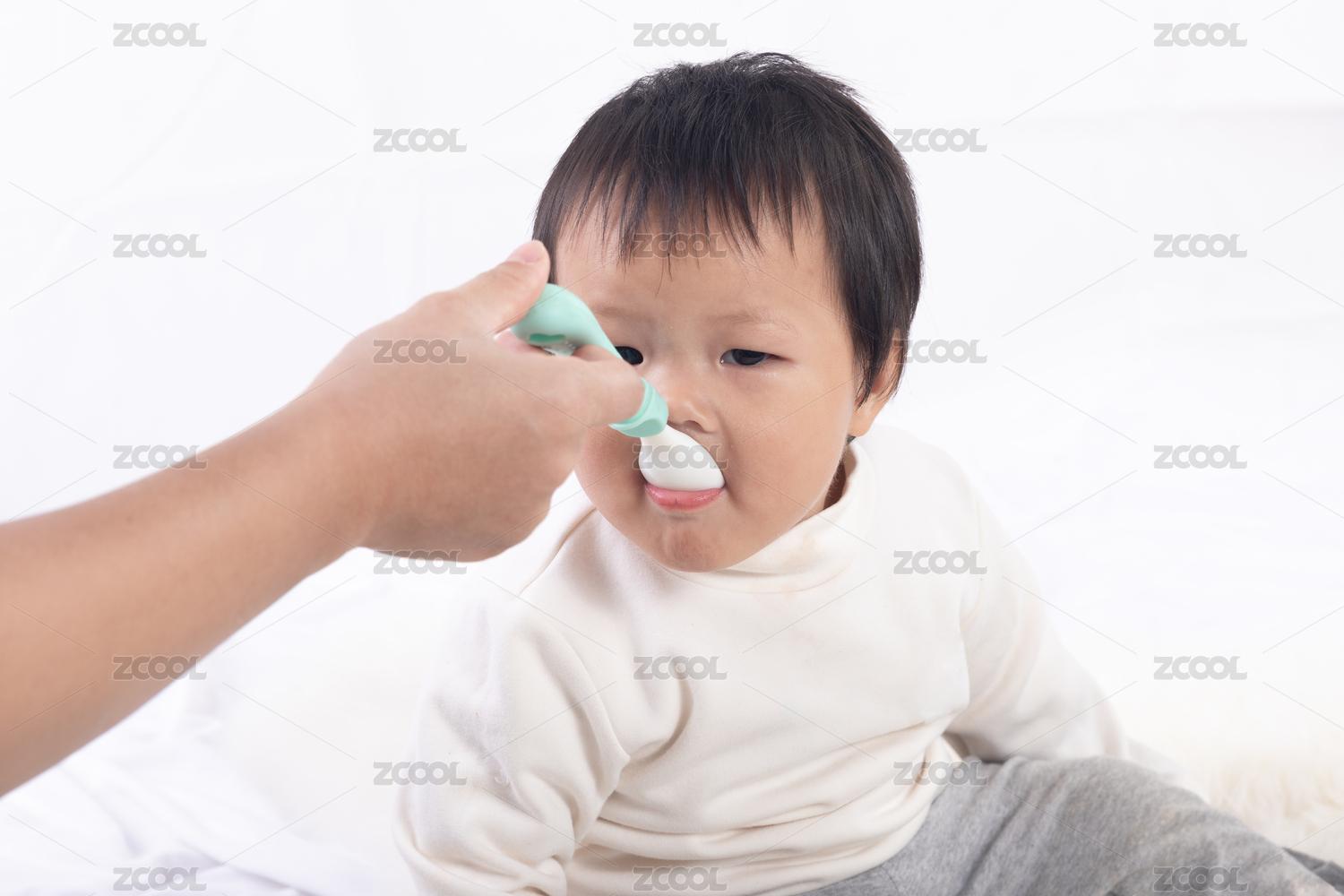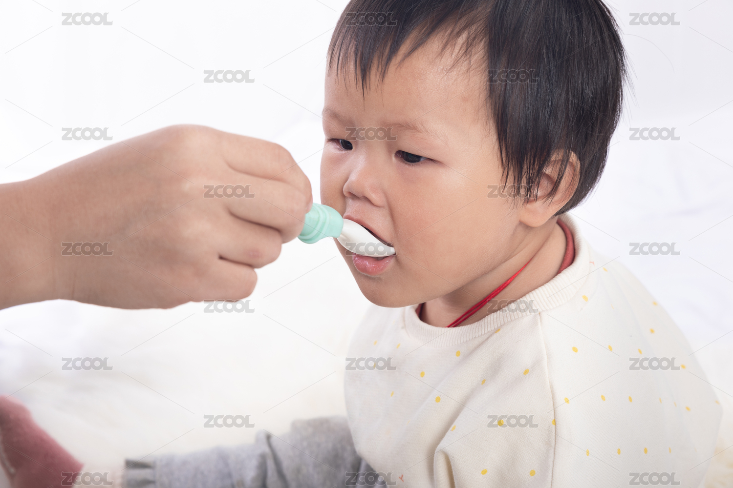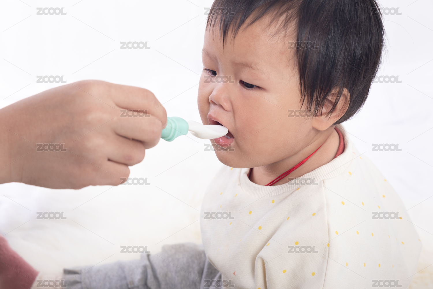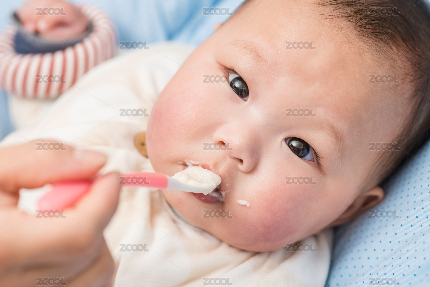 給躺著的亞洲低月齡嬰兒喂食米糊