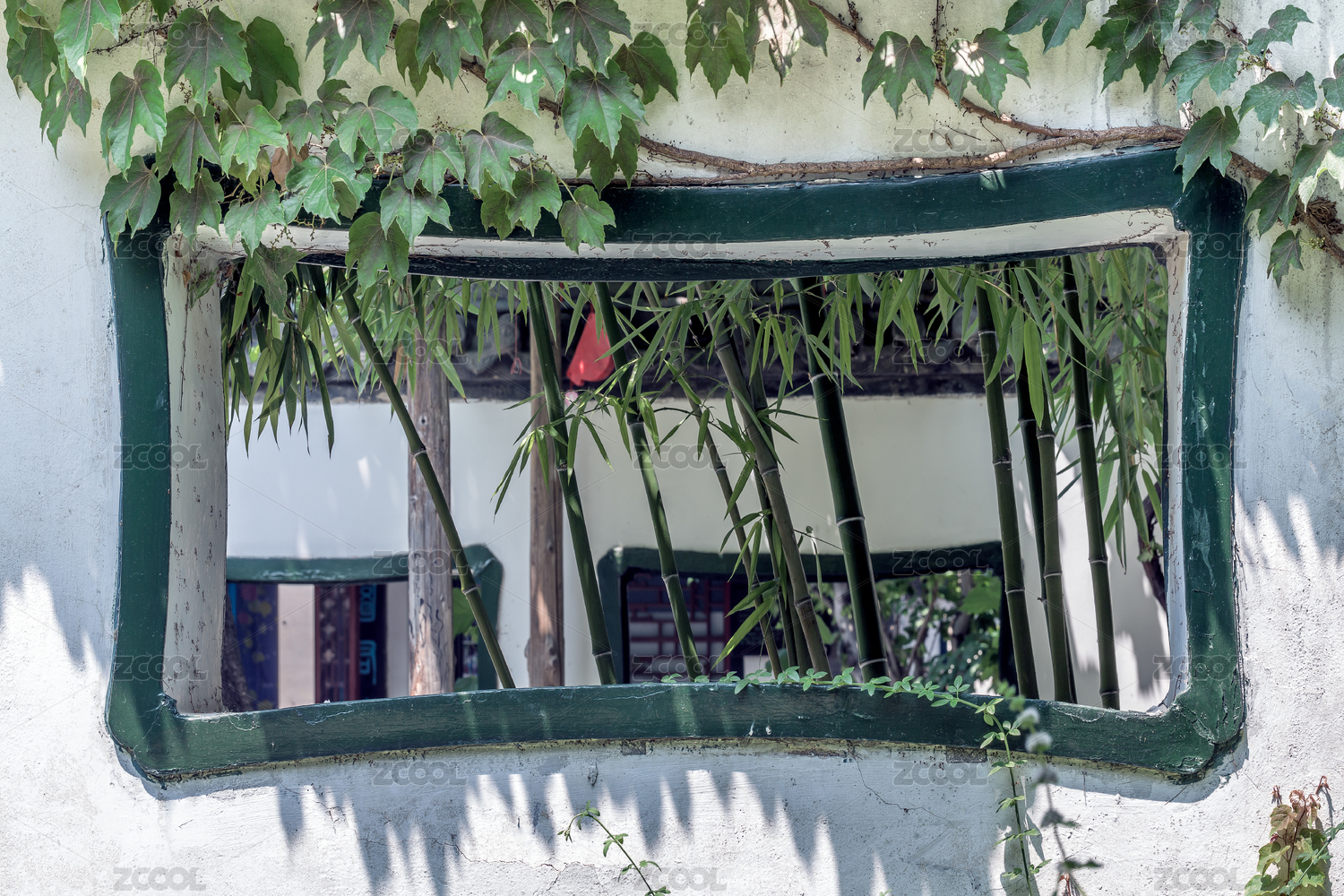 竹林前的中式漏花窗園林圍墻