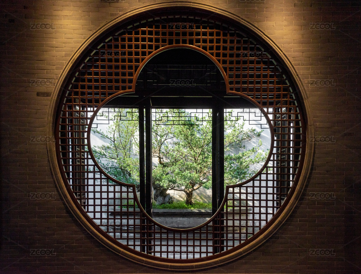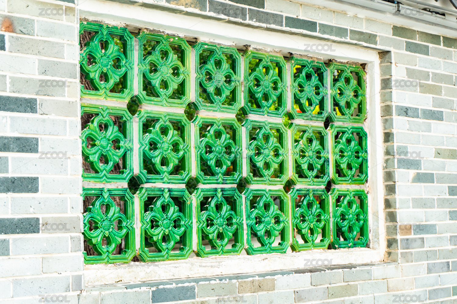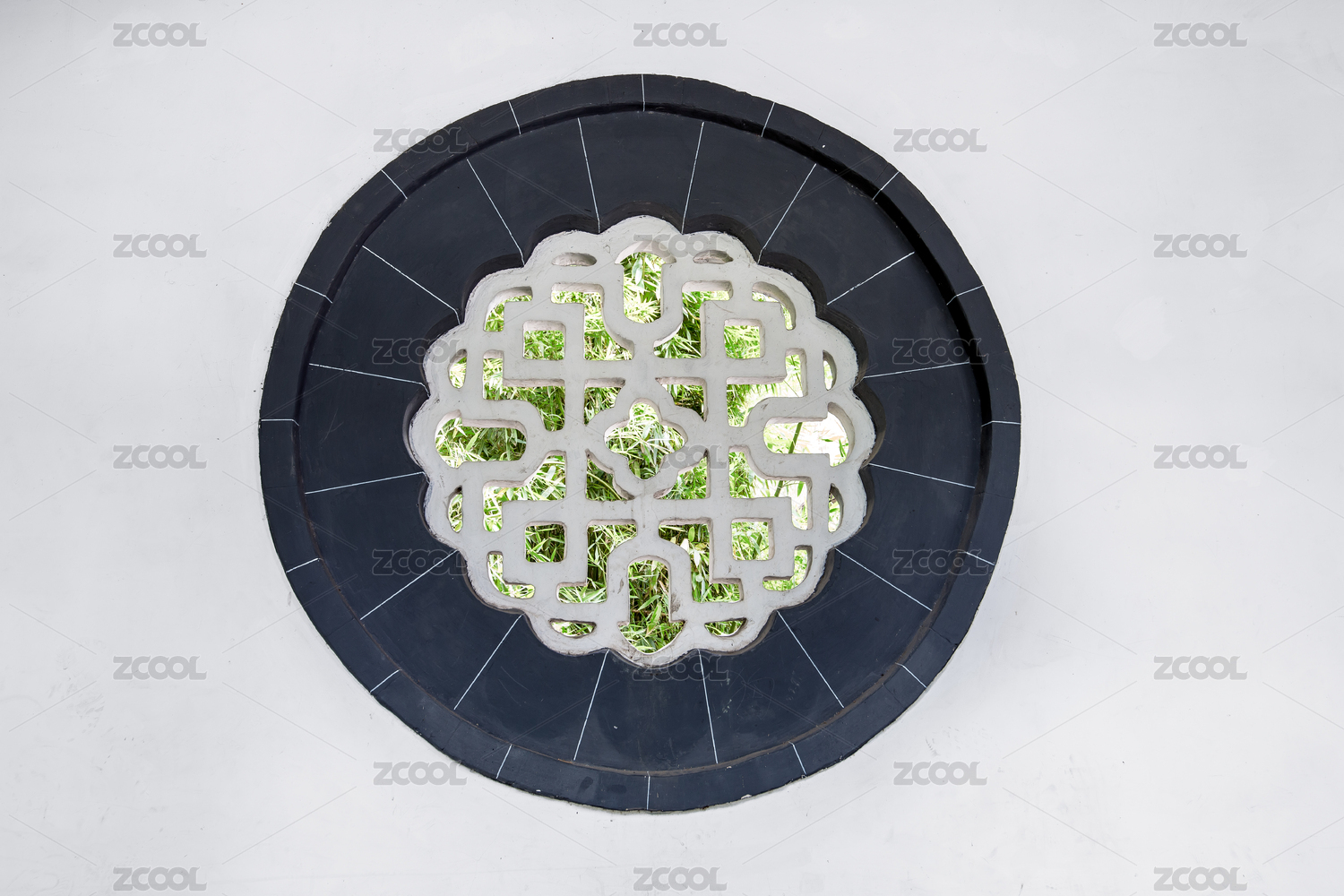 中式傳統(tǒng)園林里用瓦片搭建的鏤空窗