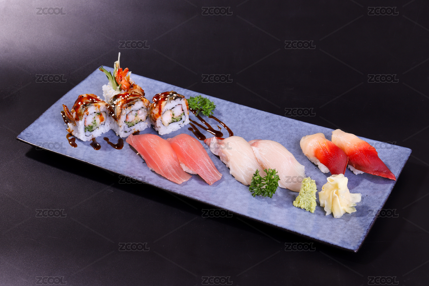 黑色背景上的生魚(yú)片壽司刺身拼盤(pán)