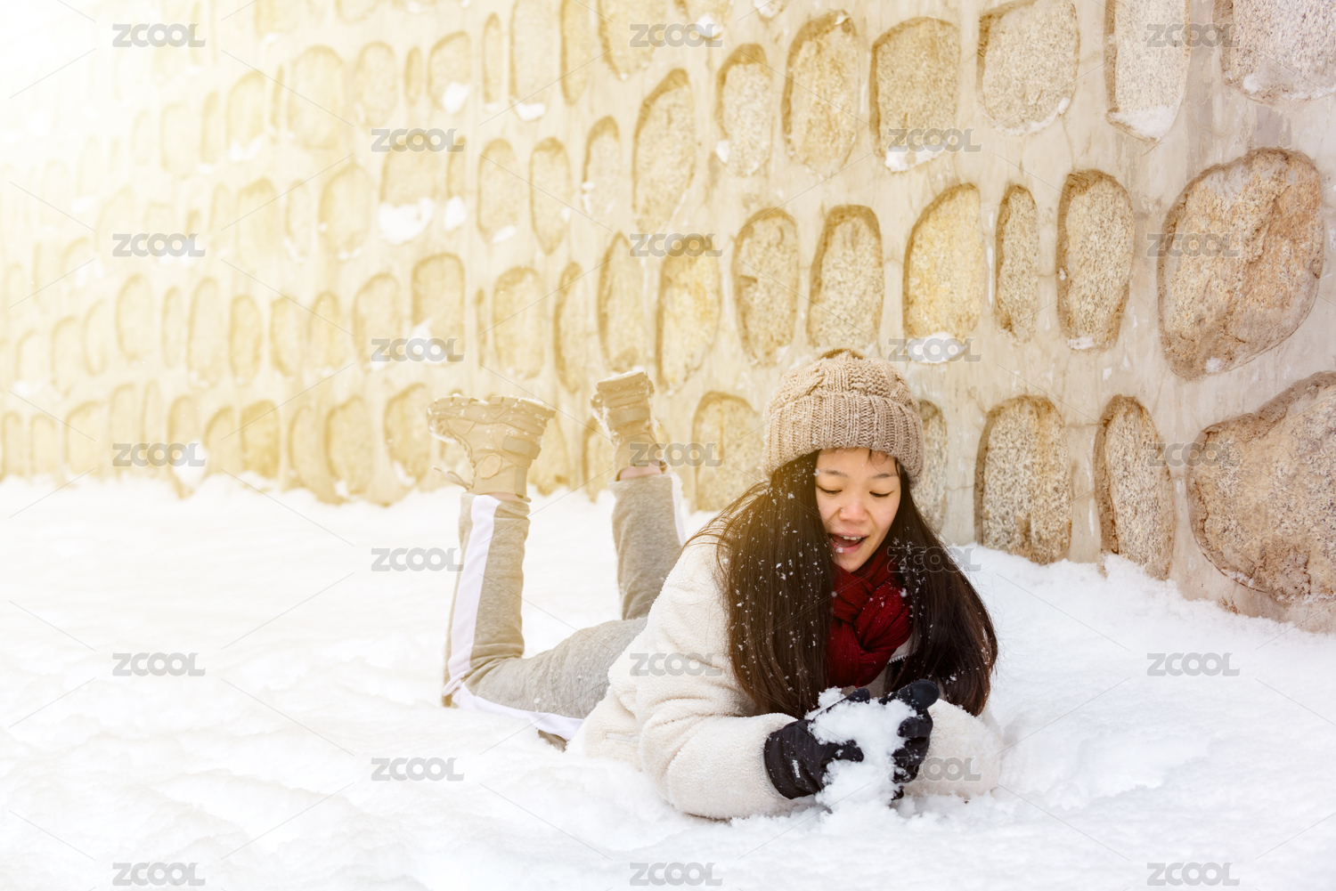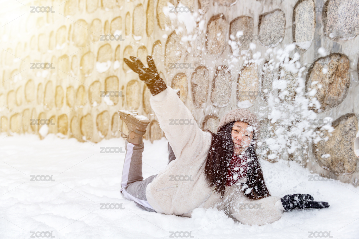 冬天趴在雪地里玩雪的女孩