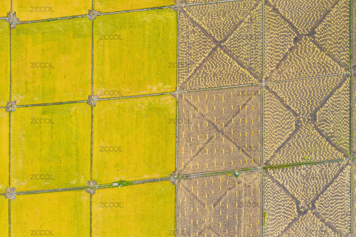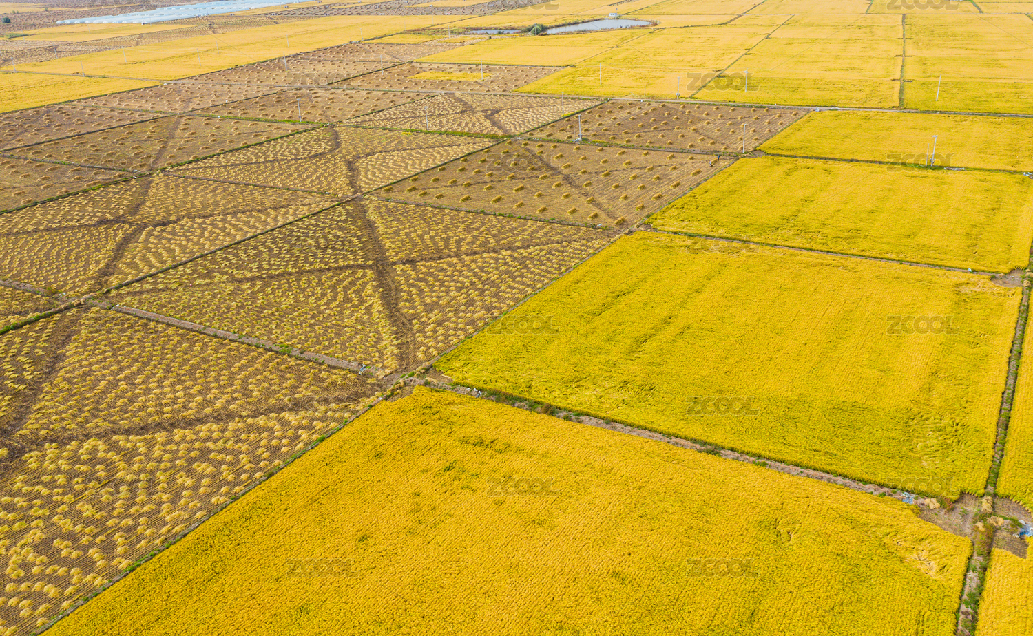 航拍五常市正在收割和為收割的水稻田